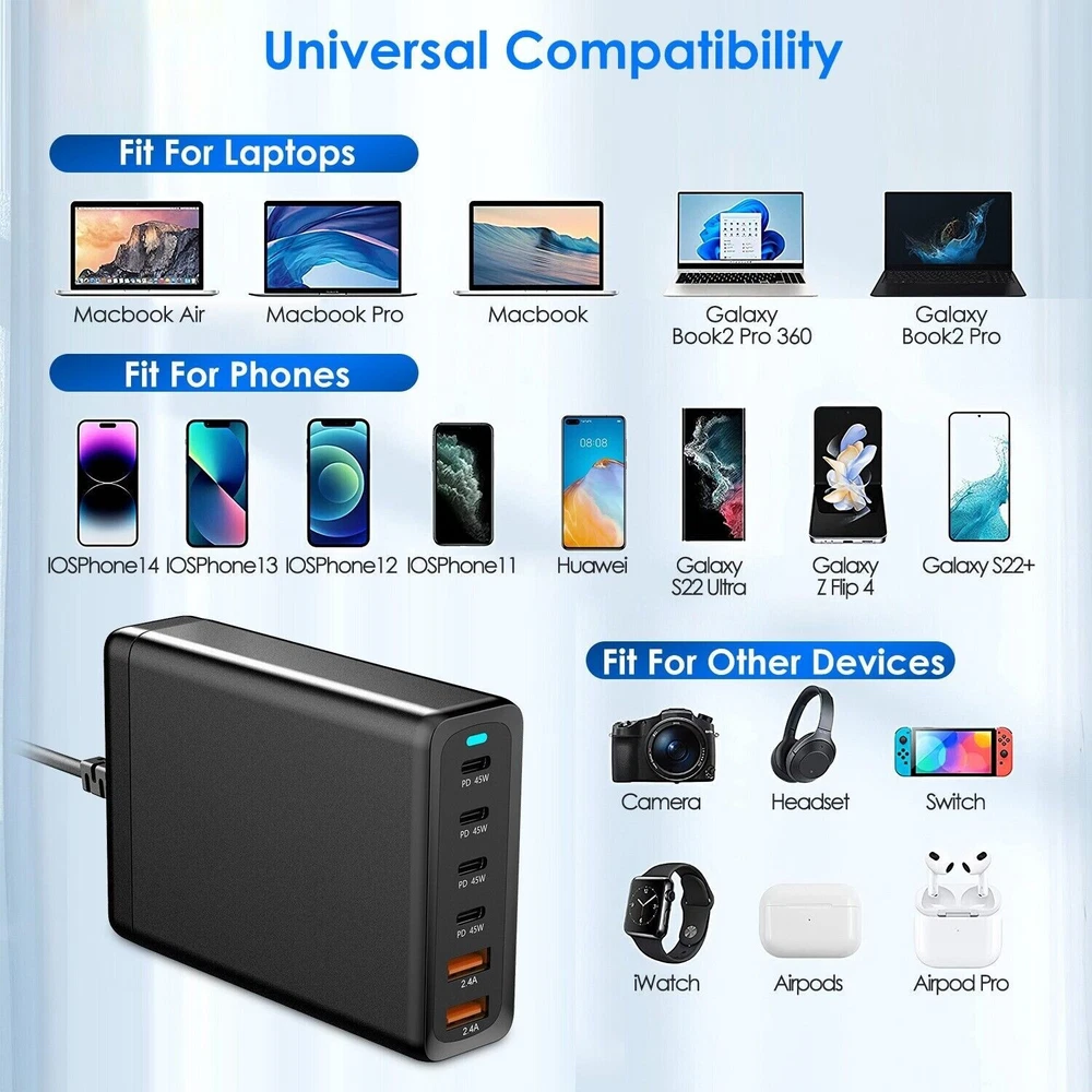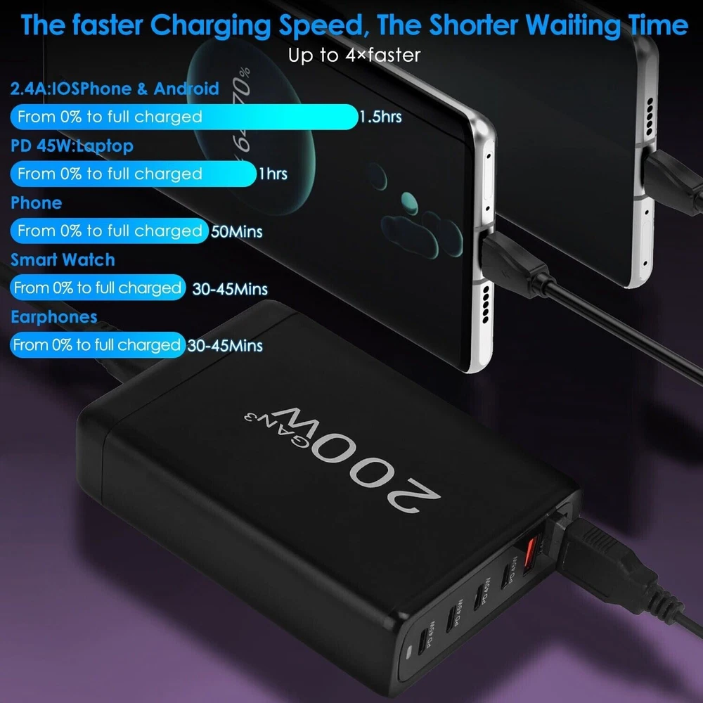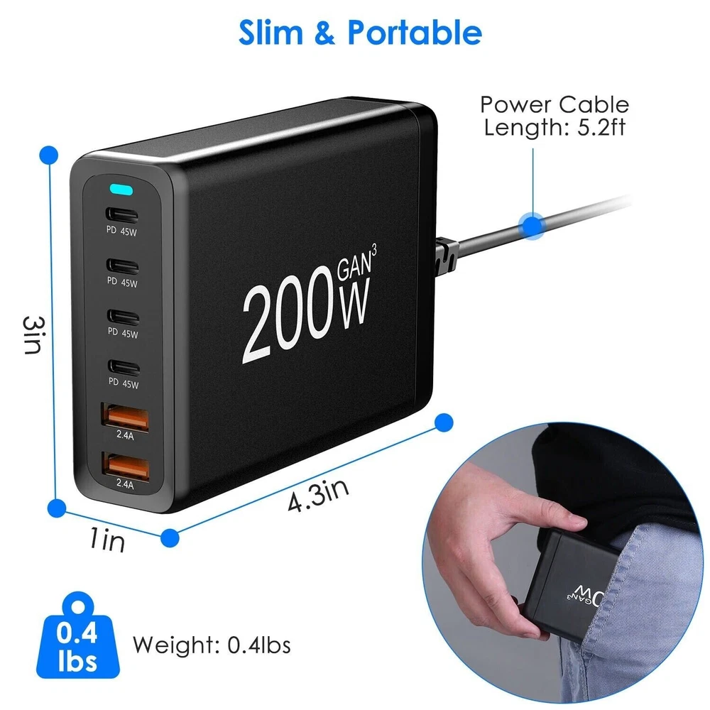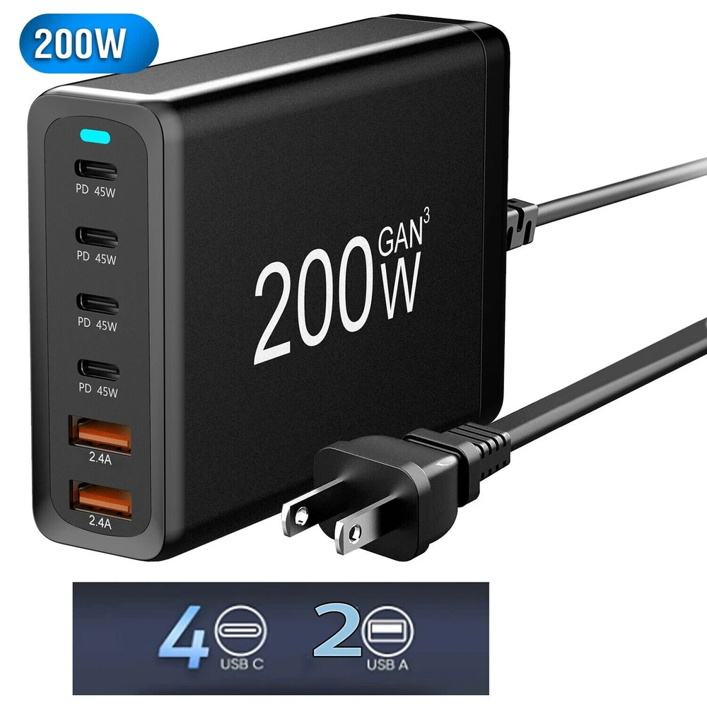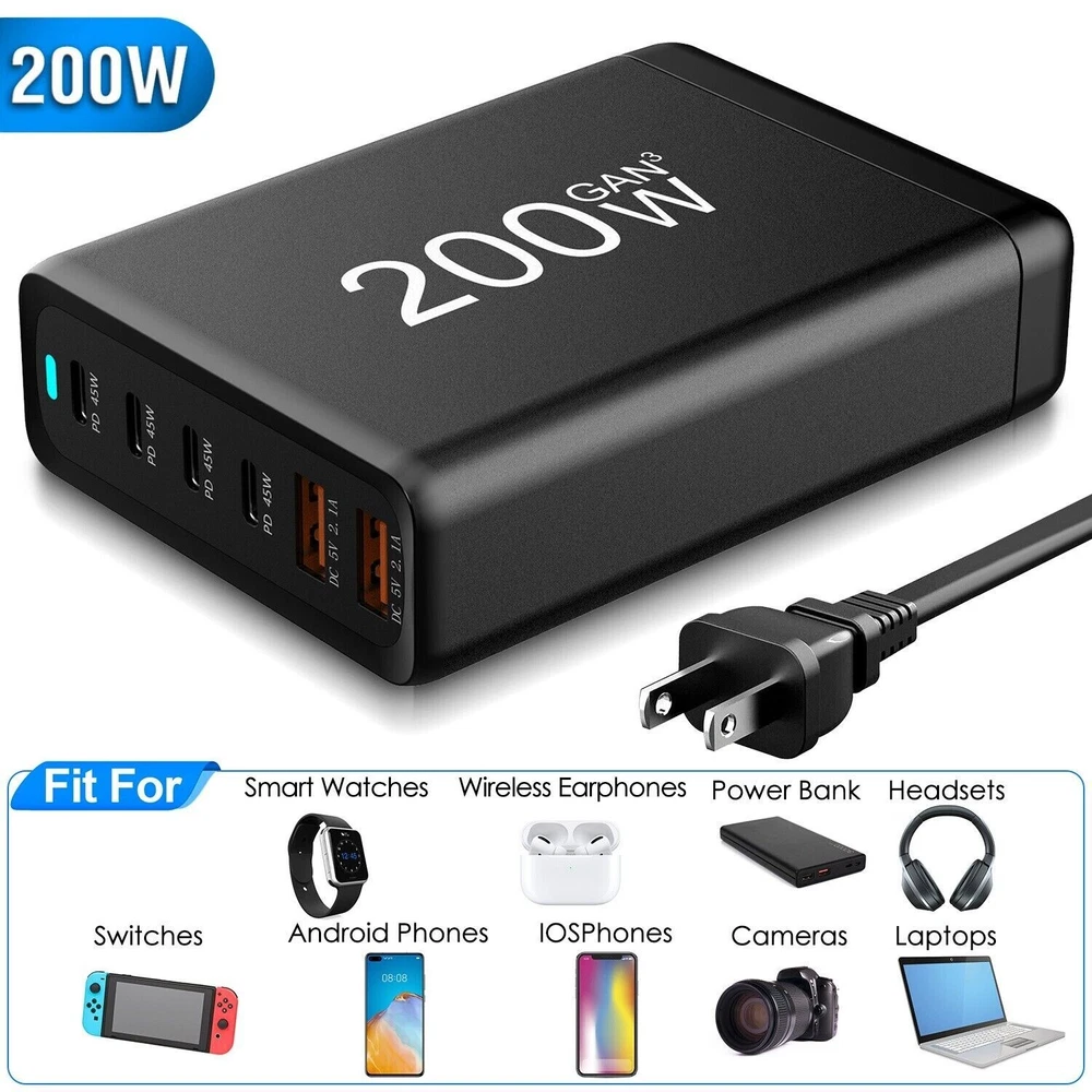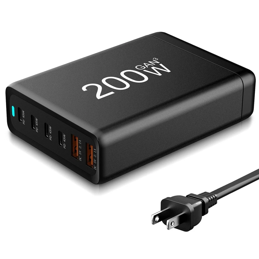 * Free 100 watt charging cord!!! ** Free EVP Protective, Shockproof Case!!! This super fast 200 Watt charger contains 6 fast charging ports, 2x 2.4A ports and 4x PD 45W ports, fully meeting various charging needs with Power Delivery and PPS technology. You can charge your phone and laptop simultaneously at lightning speeds, greatly saving time. * Featured with GaN tech chipset, this fast wall charger can charge up to 6 devices at the same time with Power Delivery technology. * The GaN chipset increases the charging efficiency up to 90%. * The compact design and 100-240 voltage input makes this charger ideal for worldwide travelling. You can charge your Microsoft Surface, iPad, Cell Phone, and Laptop at the same time with Fast Charging and Quick Charge 3.0! Features: Charging 6 Devices Simultaneously: This 6-port charging station allows you to charge 6 devices simultaneously via GaN technology. The 6 ports Desktop USB C Charging Station with 4 USB C ports and 2 USB A .45W x 4 USB C Power Delivery Compatible with Smartphone, Tablet and Laptop, Smartwatches. Works With MacBook Pro 13''/ MacBook Pro MacBook Air MacBook iPhone 14/14PLUS/14PRO/14PRO MAX 13/ 13 Mini/ 13 Pro/ 13 Pro Max iPhone 12/ 12 Mini/ 12 Pro/ 12 Pro Max/ XS/ XS Max/ XR/ X/ 11/ 11 Pro/ 11 Pro Max Samsung Galaxy S21+/ S21/ S21 Ultra/ S21 FE/ S20+/ S20/Dell XPS 15/ 13 Google Pixel. This is a universal device that can charge any of your usb-c and usb-a devices, but at super fast speeds! [Fast Charging GaN Charger]: Powered by GaN tech, full charge a 16-inch MacBook Pro in just 1.5 hours. The Gan chipset increases the charging efficiency up to 90%. Power Delivery Output from USB-C: 5V3A=15Watts, 9V3A=27Watts, 12V3A=36Watts, 15V3A= 45Watts, 20V2.25A=45Watts Super Fast Charging: 200W of total power provides a fast charging speed. If you use PD45W ports, you can fully charge your laptop within 1hour, your phone within 50 minutes, your watch or earphones within 30-45 minutes. If you use 2.4A port, you can fully charge your phone within 1.5 hour. Wide Compatibility: Widely fit for IOS Phone 13/13 Pro/13 Pro Max/13 Mini/12/11/Xs, MacBook Pro, iPad Pro, Airpod, Fit for Galaxy S21 Ultra /S21/S20 Ultra /S20 /Note 20 /Note 20 Ultra /Note 10+,Fit for Pixel 5 / 4a,Fit for Huawei/Xiaomi/Nintendo Switch and more electronic devices. Safe Charging: The Gan chipset provides under-voltage,over-power,over-current,over-temperature,over-voltage,and short circuit protection, protecting your device automatically and extending life of battery. Compact Size: Compact size and 100-240 voltage input make this charger ideal for worldwide travelling. Comes with a 5.2ft detachable power cable, convenient for you to charge on your desktop, laptop bag, bedside, counter, nightstand, office, etc.. Specifications: Name: 4C+2A 200W GAN3 Pro Charger Product Type: Desktop Fast Charger Color: Black Material: PC, ABS Input: 100-240V 50-60Hz Total Power Output: 200W Total USB Ports: 6 Compatible Devices: Laptops, IOS Phone, Android Phones, Airpods, Smart Watches, Headsets, Power Banks, Cameras, Switches, Universal Usb c, Apple, Lenovo, Sony, Ipad, Microsoft, Surface, Power bank, Mounting Type: Wall Mount / Plug in Specification Product name 200W Fast Charging USB output 5V/3A 9V-12V/1.5A Material ABS Certification CE FCC RoHS Input 100-240V 50-60HZ 0.5A Output A 5V/3A 9V/2A 12V/1.5A Output C 5V/3A 9V/2A 12V/2.5A 15V/2A 20V/1.5A pps 3.3V-11V/3A 3.3V-16V/2A Plug option US Power Cable Length: 160cm/5.2ft Item Size: 10.8x7.5x3cm/4.3x3x1in Item Weight: 186g/0.4lbs Package Size: 10.4x5x10.4cm/4x2x4in Package Weight: 302g/0.7lbs Specifications: US Plug Line length: 1M Package Contents: 1 x Desktop Fast Charger 1 x Power Cable [8 MultiProtect Safe Technique]: Our 200W usb c charger is equipped with enhanced protection: Temperature Protection, Over-Current, Over-voltage, Overcharge, Overload, Overheat and Short circuit. The certification authority of our usb-c charger is in line with UL, CE, FCC, ensuring 100% for you and your device's protection.