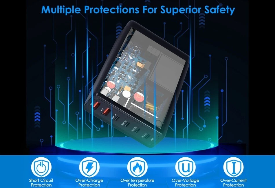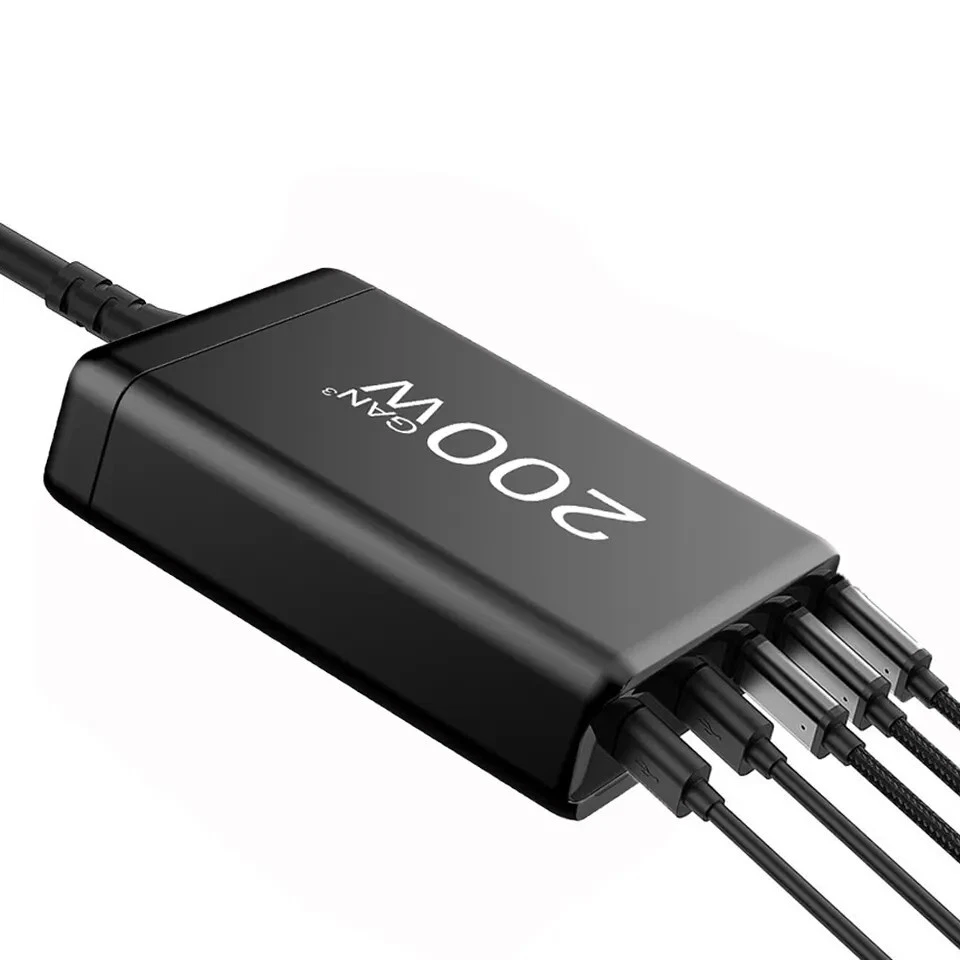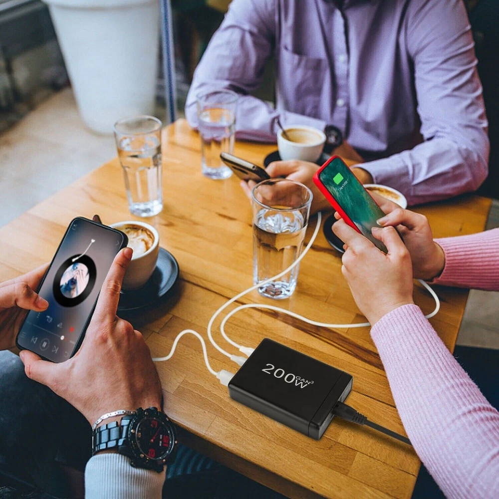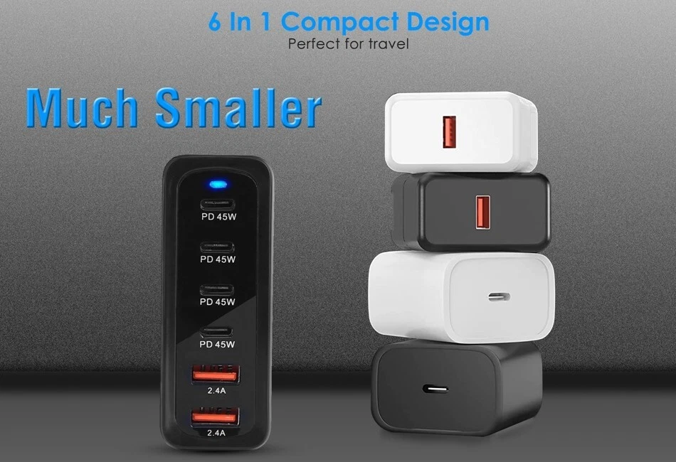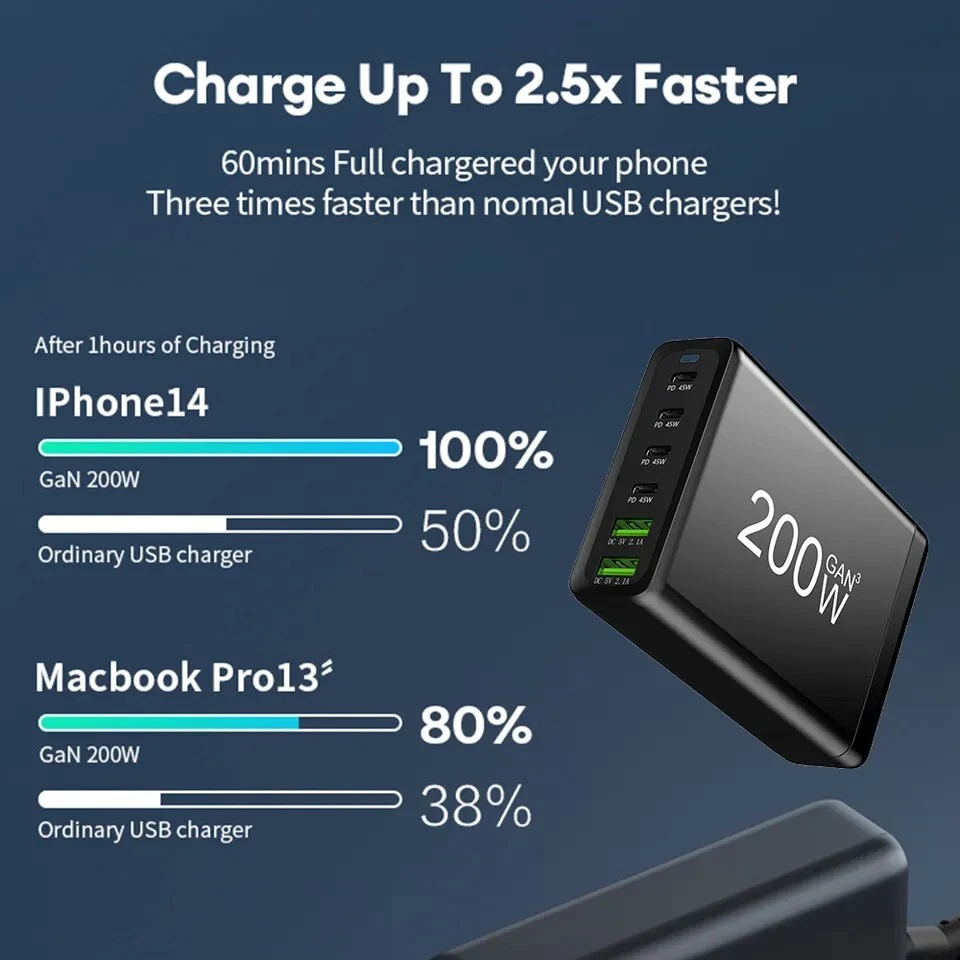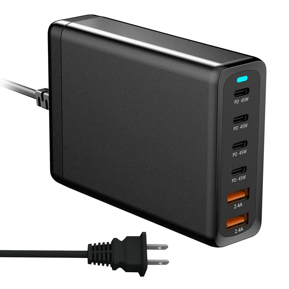 * Free 100 watt charging cord!!! ** Free EVP Protective, Shockproof Case!!! This super fast 200 Watt charger contains 6 fast charging ports, 2x 2.4A ports and 4x PD 45W ports, fully meeting various charging needs with Power Delivery and PPS technology. You can charge your phone and laptop simultaneously at lightning speeds, greatly saving time. * Featured with GaN tech chipset, this fast wall charger can charge up to 6 devices at the same time with Power Delivery technology. * The GaN chipset increases the charging efficiency up to 90%. * The compact design and 100-240 voltage input makes this charger ideal for worldwide travelling. You can charge your Microsoft Surface, iPad, Cell Phone, and Laptop at the same time with Fast Charging and Quick Charge 3.0! Features: Charging 6 Devices Simultaneously: This 6-port charging station allows you to charge 6 devices simultaneously via GaN technology. The 6 ports Desktop USB C Charging Station with 4 USB C ports and 2 USB A .45W x 4 USB C Power Delivery Compatible with Smartphone, Tablet and Laptop, Smartwatches. Works With MacBook Pro 13''/ MacBook Pro MacBook Air MacBook iPhone 14/14PLUS/14PRO/14PRO MAX 13/ 13 Mini/ 13 Pro/ 13 Pro Max iPhone 12/ 12 Mini/ 12 Pro/ 12 Pro Max/ XS/ XS Max/ XR/ X/ 11/ 11 Pro/ 11 Pro Max Samsung Galaxy S21+/ S21/ S21 Ultra/ S21 FE/ S20+/ S20/Dell XPS 15/ 13 Google Pixel. This is a universal device that can charge any of your usb-c and usb-a devices, but at super fast speeds! [Fast Charging GaN Charger]: Powered by GaN tech, full charge a 16-inch MacBook Pro in just 1.5 hours. The Gan chipset increases the charging efficiency up to 90%. Power Delivery Output from USB-C: 5V3A=15Watts, 9V3A=27Watts, 12V3A=36Watts, 15V3A= 45Watts, 20V2.25A=45Watts Super Fast Charging: 200W of total power provides a fast charging speed. If you use PD45W ports, you can fully charge your laptop within 1hour, your phone within 50 minutes, your watch or earphones within 30-45 minutes. If you use 2.4A port, you can fully charge your phone within 1.5 hour. Wide Compatibility: Widely fit for IOS Phone 13/13 Pro/13 Pro Max/13 Mini/12/11/Xs, MacBook Pro, iPad Pro, Airpod, Fit for Galaxy S21 Ultra /S21/S20 Ultra /S20 /Note 20 /Note 20 Ultra /Note 10+,Fit for Pixel 5 / 4a,Fit for Huawei/Xiaomi/Nintendo Switch and more electronic devices. Safe Charging: The Gan chipset provides under-voltage,over-power,over-current,over-temperature,over-voltage,and short circuit protection, protecting your device automatically and extending life of battery. Compact Size: Compact size and 100-240 voltage input make this charger ideal for worldwide travelling. Comes with a 5.2ft detachable power cable, convenient for you to charge on your desktop, laptop bag, bedside, counter, nightstand, office, etc.. Specifications: Name: 4C+2A 200W GAN3 Pro Charger Product Type: Desktop Fast Charger Color: Black Material: PC, ABS Input: 100-240V 50-60Hz Total Power Output: 200W Total USB Ports: 6 Compatible Devices: Laptops, IOS Phone, Android Phones, Airpods, Smart Watches, Headsets, Power Banks, Cameras, Switches, Universal Usb c, Apple, Lenovo, Sony, Ipad, Microsoft, Surface, Power bank, Mounting Type: Wall Mount / Plug in Specification Product name 200W Fast Charging USB output 5V/3A 9V-12V/1.5A Material ABS Certification CE FCC RoHS Input 100-240V 50-60HZ 0.5A Output A 5V/3A 9V/2A 12V/1.5A Output C 5V/3A 9V/2A 12V/2.5A 15V/2A 20V/1.5A pps 3.3V-11V/3A 3.3V-16V/2A Plug option US Power Cable Length: 160cm/5.2ft Item Size: 10.8x7.5x3cm/4.3x3x1in Item Weight: 186g/0.4lbs Package Size: 10.4x5x10.4cm/4x2x4in Package Weight: 302g/0.7lbs Specifications: US Plug Line length: 1M Package Contents: 1 x Desktop Fast Charger 1 x Power Cable [8 MultiProtect Safe Technique]: Our 200W usb c charger is equipped with enhanced protection: Temperature Protection, Over-Current, Over-voltage, Overcharge, Overload, Overheat and Short circuit. The certification authority of our usb-c charger is in line with UL, CE, FCC, ensuring 100% for you and your device's protection.