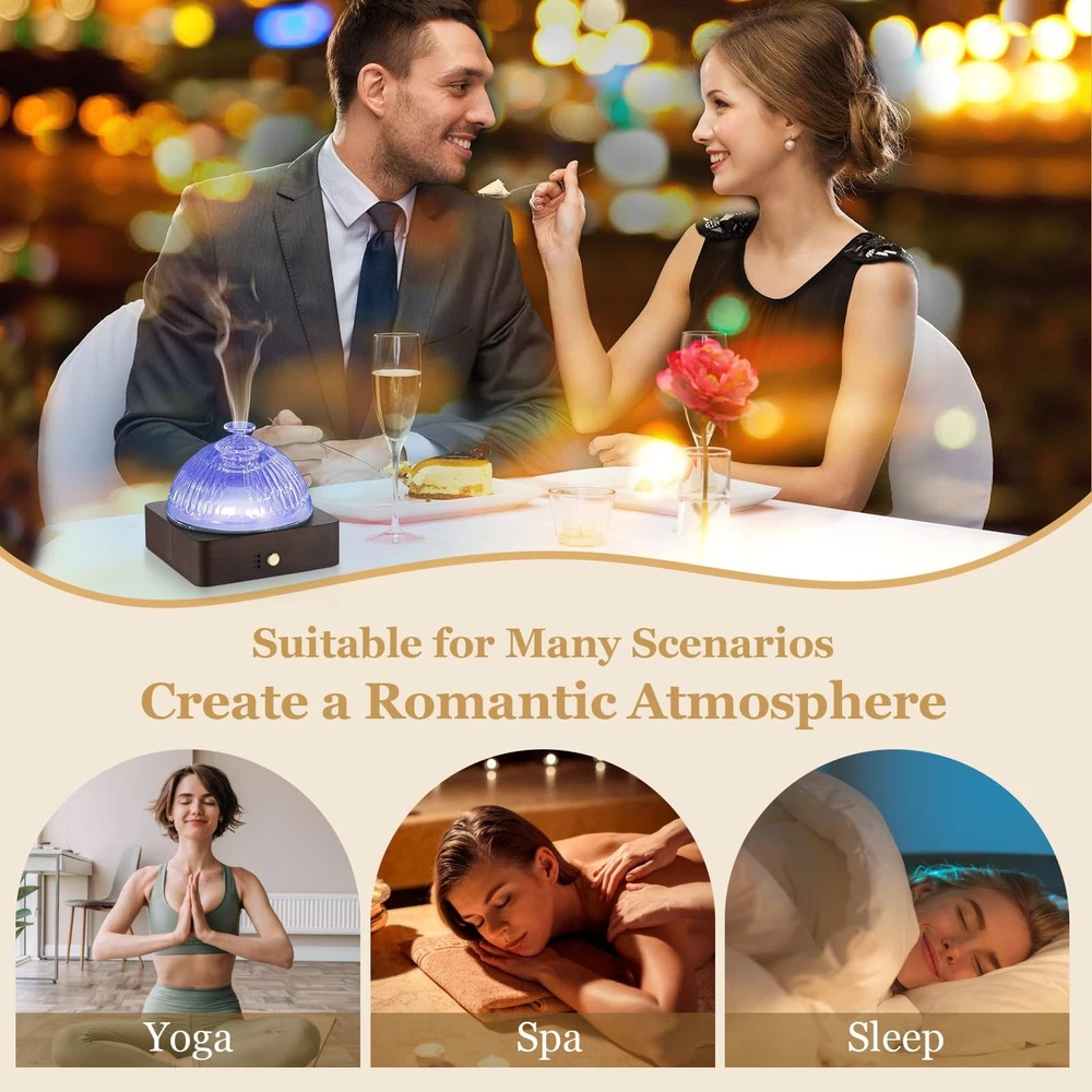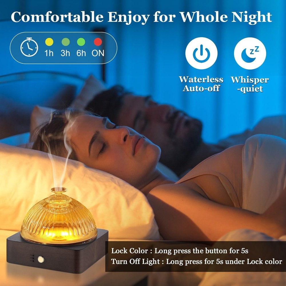 Please Note: 1.For use the product better, we have added Troubleshooting help in the manual. 2.Oil is not included in the package. 3.Use with natural essential oil. Do not use chemical essential oils which are corrosive. 4.Clean the diffuser after 3- 5times or 3-5 days of use. 5.Do not exceed the Max line 200ml when filling water (don't use the boiling water). 6. Don't open the diffuser cover when using. 7. Please add water below the max line (less water, more mist). ♨【Real Glass Reservoir Diffuser】This 200ml aromatherapy diffuser features a hand-blown glass reservoir and glass dome cover, crafted by artisans with over 20 years of experience, set on a wooden base. Unlike plastic reservoir diffusers that can absorb essential oils, this No-BPA glass reservoir diffuser allows the the natural ingredient of essential oils to remain optimal for a healthy diffusion. This glass diffuser is planet-friendlly and delivers a top-tier aromatherapy experience. ♨【Lock the Color by LONG PRESS 5S】This glass essential oil diffuser cycles through 7 soft colors - simply Long Press (5S) to lock your favorite light color that matches your mood. Turn Off the light: Long Press 5S to turn off the light After locked the light. The perfect pairing of cool mist and mood lights promotes relaxation. Add 1-3 drops of essential oils and water for 8-10 hours of aromatic bliss. Let the aromatherapy permeate any space - small or large room. ♨【Easy to Use & Auto Shut Off】This air aroma glass diffuser for home is designed for ease of use with one-button control of the soothing mist and colorful mood lights. It will automatically shut off when the water runs out to prevent overheating and ensure safe. Simply long press (5S) to lock in your favorite light color. You can also long press 5S to turn off the light After locked the lights if you don't want any disturbance. ♨【Ultra Quiet & 4 Timer Setting】This small diffuser utilizes advanced 3.5MHz ultrasonic technology to produce an ultra-fine mist while keeping noise under 30dB - perfect for sleep or relaxation. Choose from 1, 3, and 6-hours, or continuous on. Enjoy aromatherapy's benefits anywhere - home, bedroom, office, yoga, pilates, coffee shop, studio, nursery, or spa. The possibilities are endless with our quiet, versatile diffuser. ♨【Ideal Creative & Practical Choice】Room glass diffuser adopts ultrasonic technology to release cool mist. 3-in-1 glass aromatherapy diffuser serves as a humidifier, air aroma machine and night light all in one, and is ideal for relaxation, yoga, sleep, or self-meditation. The small aroma diffuser is a great Choice for housewarming, birthday, family, friends, wife, mom, lover, Christmas Day, Anniversary, Valentines Day, Thanksgiving Day, Wedding day. ♨♨【QUALITY SERVICE】As the diffusers glass is fragile, if there is any damage upon arrival, please contact us promptly for replacement, return, refund. We are committed to providing excellent customer service, If you have any questions, please log in to your Amazon account > choose "Your orders" > find the order ID > click "Contact seller, we will provide you with a contented solution!