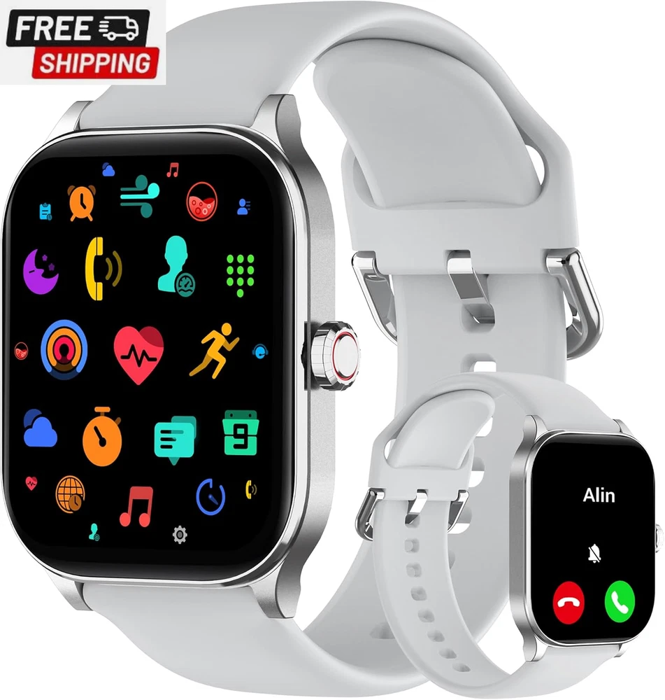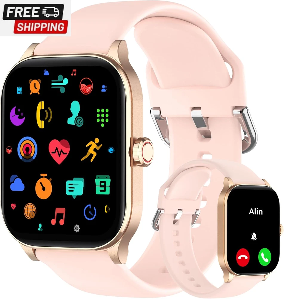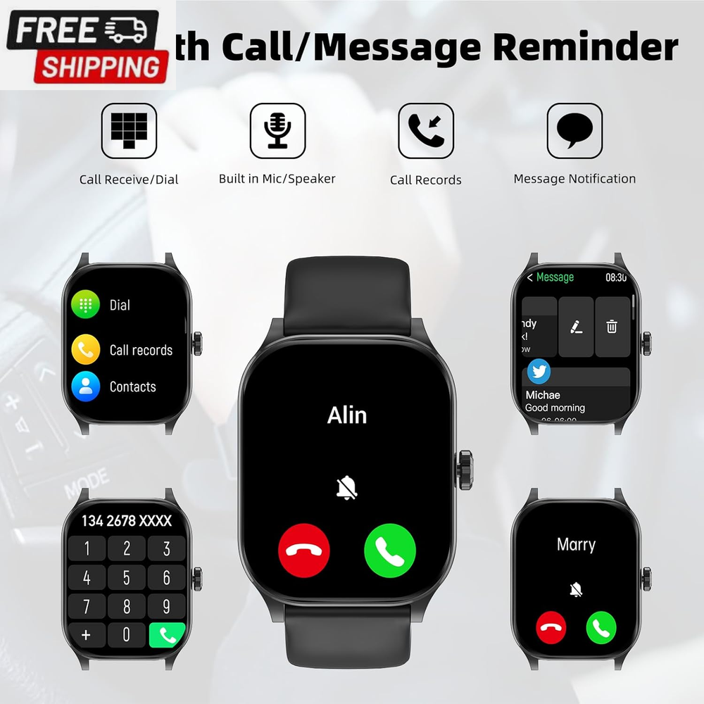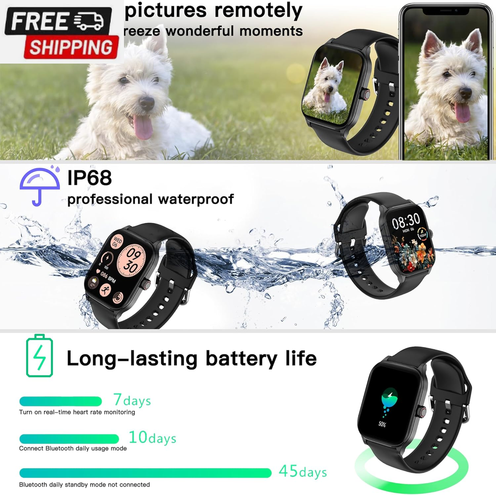 This smartwatch is a game-changer! The large 2.01" screen is crystal clear, and I love being able to answer calls directly from my wrist. The fitness tracking is super accurate - heart rate, sleep monitoring, and step counting all work flawlessly. It syncs perfectly with both my Android phone and my wife's iPhone. The battery lasts for days, and the IP68 waterproofing gives me peace of mind during workouts. Setup was a breeze, and the customer service team was incredibly helpful when I had questions. For the price, you get premium features usually found in much more expensive models. The fast shipping and money-back guarantee made buying risk-free. Highly recommended for anyone wanting a feature-packed smartwatch!