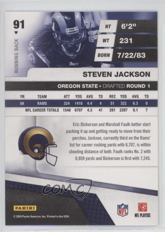 2010 Panini Absolute Memorabilia - [Base] #91 Steven Jackson - Football Card - Featuring the St. Louis Rams - Featuring Steven Jackson Search for more: 2010 Panini Absolute Memorabilia Search for more: 2010 Panini Absolute Memorabilia - [Base] View all of our Listings Auctions Buy It Now About Us Located in the beautiful Pacific Northwest, COMC (Check Out My Cards) is the world's largest consignment service for trading card singles. More than 10,000 people have used our consignment service to list over 50 million trading cards. Find out how we can help you consign your items on eBay by contacting us through eBay messaging. COMC -- "The Safe & Easy Way to Buy & Sell" Representative Image - Select Specific Item above to see image of actual item Representative Image - Select Specific Item above to see image of actual item Raw Condition for Modern Cards Unless otherwise noted, raw modern cards are listed in Near Mint-Mint condition or better. A NM-MT card appears to be Mint at first glance, but upon closer inspection, may exhibit some of the following: minor print defects (e.g. roller marks, print line, dimple), minor scratches, slight edge wear, and slight corner wear. Centering is clearly visible in the images provided and does not factor into our condition assessment. Raw Condition for Vintage Cards Unless otherwise noted, raw vintage cards are listed in Excellent condition or better. An EX card may exhibit some of the following: minor rounding of corners, surface wear, print defects, light scratches, and slight edge wear/chipping. Centering is clearly visible in the images provided and does not factor into our condition assessment. Domestic Shipping Combined shipping for multiple items is available. To receive combined shipping, please ensure all desired items are in your eBay shopping cart before proceeding to checkout. eBay limits orders to 40 items per order. We automatically combine multiple orders placed on the same day. If you place multiple orders on the same day, please contact us to request a refund of applicable shipping costs. Signature confirmation may be required on invoices over $400. All cards are protected and shipped securely. International Shipping COMC offers eBay's International Shipping (EIS) for international orders under $2,500* (see country exceptions below). All duties and import fees are paid at checkout; in the rare event that there are additional import fees upon delivery, these are borne by the buyer. EIS packages route through a shipping hub in Erlanger, KY before shipping to their final destination. Please note that EIS does not allow for combined shipments. The shipping rates are determined by eBay and cannot be adjusted. *Maximum sale price exceptions: Colombia, Kuwait ($2,000); Taiwan ($1,539); Chile, Costa Rica, Guatemala, Honduras, Trinidad and Tobago ($1,000); Antigua and Barbuda, Aruba, Belize, Dominica, Grenada, Philippines, Saint Kitts and Nevis, Saint Lucia, Montserrat, Turks and Caicos Islands ($500); Dominican Republic, El Salvador ($200). Please request a shipping quote through eBay messaging for orders that exceed the maximum sale price supported by eBay's International Shipping. You will be responsible for all duties and import fees for international orders shipped outside the EIS. All cards are protected and shipped securely. Payment COMC does not accept offers on our cards through our eBay storefront. COMC utilizes eBay’s managed payments system. If you are experiencing difficulties making a payment, please contact eBay for assistance. Return Policy Returns are only accepted on the rare occasion the item is not as described. If you are making a return, please initiate the return process through eBay so a mailing label can be provided for you. Prior to listing, our expert team carefully assessed this item to represent it accurately. Please review the description and high-definition images prior to purchasing to ensure this item meets your satisfaction. We welcome you to contact us if you have further questions about this item. Trust and Integrity COMC carefully assesses each item consigned to us to prevent fraudulent items from entering the marketplace. If you believe an item offered on COMC may be fraudulent, please contact us with details so we can investigate the issue. Items we determine are outside our supported items policy may be removed. Last Modified: 1/30/2025 5:23:30 PM PDT