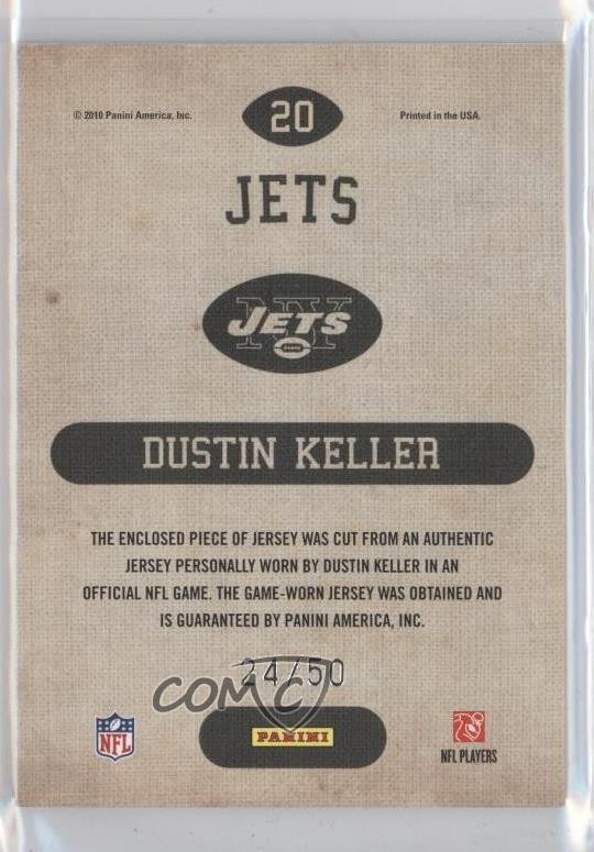 2010 Panini Threads - Game Day Jerseys - Prime #20 Dustin Keller Qty Made: 50 - Football Card - Featuring the New York Jets - Featuring Dustin Keller Search for more: 2010 Panini Threads Search for more: 2010 Panini Threads - Game Day Jerseys - Prime View all of our Listings Auctions Buy It Now About Us Located in the beautiful Pacific Northwest, COMC (Check Out My Cards) is the world's largest consignment service for trading card singles. More than 10,000 people have used our consignment service to list over 50 million trading cards. Find out how we can help you consign your items on eBay by contacting us through eBay messaging. COMC -- "The Safe & Easy Way to Buy & Sell" Representative Image - Select Specific Item above to see image of actual item Representative Image - Select Specific Item above to see image of actual item Raw Condition for Modern Cards Unless otherwise noted, raw modern cards are listed in Near Mint-Mint condition or better. A NM-MT card appears to be Mint at first glance, but upon closer inspection, may exhibit some of the following: minor print defects (e.g. roller marks, print line, dimple), minor scratches, slight edge wear, and slight corner wear. Centering is clearly visible in the images provided and does not factor into our condition assessment. Raw Condition for Vintage Cards Unless otherwise noted, raw vintage cards are listed in Excellent condition or better. An EX card may exhibit some of the following: minor rounding of corners, surface wear, print defects, light scratches, and slight edge wear/chipping. Centering is clearly visible in the images provided and does not factor into our condition assessment. Domestic Shipping Combined shipping for multiple items is available. To receive combined shipping, please ensure all desired items are in your eBay shopping cart before proceeding to checkout. eBay limits orders to 40 items per order. We automatically combine multiple orders placed on the same day. If you place multiple orders on the same day, please contact us to request a refund of applicable shipping costs. Signature confirmation may be required on invoices over $400. All cards are protected and shipped securely. International Shipping COMC offers eBay's International Shipping (EIS) for international orders under $2,500* (see country exceptions below). All duties and import fees are paid at checkout; in the rare event that there are additional import fees upon delivery, these are borne by the buyer. EIS packages route through a shipping hub in Erlanger, KY before shipping to their final destination. Please note that EIS does not allow for combined shipments. The shipping rates are determined by eBay and cannot be adjusted. *Maximum sale price exceptions: Colombia, Kuwait ($2,000); Taiwan ($1,539); Chile, Costa Rica, Guatemala, Honduras, Trinidad and Tobago ($1,000); Antigua and Barbuda, Aruba, Belize, Dominica, Grenada, Philippines, Saint Kitts and Nevis, Saint Lucia, Montserrat, Turks and Caicos Islands ($500); Dominican Republic, El Salvador ($200). Please request a shipping quote through eBay messaging for orders that exceed the maximum sale price supported by eBay's International Shipping. You will be responsible for all duties and import fees for international orders shipped outside the EIS. All cards are protected and shipped securely. Payment COMC does not accept offers on our cards through our eBay storefront. COMC utilizes eBay’s managed payments system. If you are experiencing difficulties making a payment, please contact eBay for assistance. Return Policy Returns are only accepted on the rare occasion the item is not as described. If you are making a return, please initiate the return process through eBay so a mailing label can be provided for you. Prior to listing, our expert team carefully assessed this item to represent it accurately. Please review the description and high-definition images prior to purchasing to ensure this item meets your satisfaction. We welcome you to contact us if you have further questions about this item. Trust and Integrity COMC carefully assesses each item consigned to us to prevent fraudulent items from entering the marketplace. If you believe an item offered on COMC may be fraudulent, please contact us with details so we can investigate the issue. Items we determine are outside our supported items policy may be removed. Last Modified: 7/20/2025 9:48:01 AM PDT