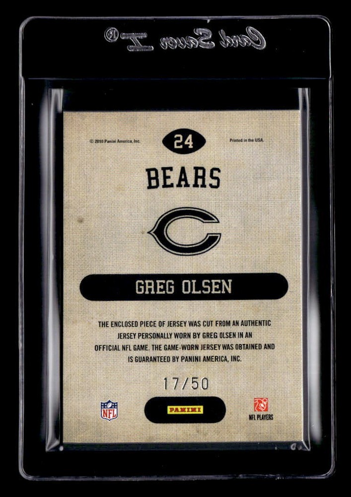 Most photos shown are BECKETT STOCK PHOTOS . The stock photo is there to give you an idea of what that particular card looks like. If the photo does not match the description, please contact us before purchasing. The condition of the card you will receive is stated in the title of the listing. See below for a description of what each grade will look like. For vintage, do not refer to the scan for condition. The condition is stated in the title. If you have any questions, please message us before purchasing. Shipping is $4.00 plus 50 cents for each additional card. If you are ordering multiple cards, please add all items to your cart and then make 1 payment. Orders that are placed separately will not be combined or have shipping refunded. International shipping rates vary by country Thanks! Near Mint/Mint 8 Centering: 60/40 both ways or better on front. 80/20 or better on back. Corners: Sharp to the naked eye, but slight imperfections allowed under close examination. Edges: Relatively smooth borders. Specks of chipping visible to the naked eye are allowed. Surface: A few minor print spots. Very minor color or focus imperfections. Solid gloss with very minor scratches detectable only upon close inspection. Or a subtle metallic print line. Near Mint 7 Centering: 65/35 both ways or better on front. 90/10 or better on back. Very slight diamond cutting is allowed. Corners: Very minor wear on two or three corners is allowed. Edges: Slight roughness, minor chipping or very minor notching is allowed. Surface: A few noticeable print spots or minor speckling is allowed. Minor color or focus imperfections. Very minor border discoloration. A very minor wax stain on back. Solid gloss with a few minor scratches detectable upon close inspection. A few metallic print lines. Excellent Mint 6 Centering: 70/30 both ways or better on front. 95/5 or better on back. Slight diamond cutting is allowed. Corners: Fuzzy corners, but free of dings and fraying. Edges: Moderate roughness, moderate chipping or minor notching is allowed. Surface: Noticeable print spots. Minor color or focus imperfections. Minor border discoloration and color or focus imperfections. Minor wax stains or extremely subtle ink marks. Relatively solid gloss with minor scratches, but devoid of scuffing. Noticeable metallic print lines. Excellent 5 Centering: 75/25 both ways or better on front. 95/5 or better on back. Slight diamond cutting is allowed. Corners: Four fuzzy corners, a touch of notching or a minor ding is allowed. Edges: Noticeable roughness - but no layering. Very slight notching or noticeable chipping is allowed. Surface: Noticeable print spots. Minor color or focus imperfections. Minor border discoloration. Minor wax stains or very light ink mark. Some gloss lost from surface with minor scratches, but devoid of scuffing. Very Good/Excellent - 4 Centering: 80/20 both ways or better on front. 100/0 or better on back. Moderate diamond cutting is allowed. Corners: Slight notching or layering, or moderate dings are allowed. Edges: Readily chipped or notched and/or slightly layered. Surface: Heavy print spots. Hairline creases. Moderate color or focus imperfections. Moderate border discoloration. Moderate wax stains. Very light ink mark or tape stain. A good deal of gloss lost from surface. Very minor scuffing or an extremely subtle tear in the form of a touch of broken surface paper. Very Good 3 Centering: 85/15 both ways or better on front. 100/0 or better on back. Moderate diamond cutting is allowed. Corners: Slightly rounded or noticeably notched corners with slight layering is allowed. Edges: Heavy notching, moderate layering or heavy chipping is allowed. Surface: Heavy print spots. Very minor creases. Noticeable color or focus imperfections. Noticeable border discoloration. Noticeable wax stains. Light ink mark or tape stain. Very little surface gloss. Minor scuffing or a very minor tear. Good 2 Centering: 90/10 both ways or better on front. 100/0 or offcut on back. Noticeable diamond cutting is allowed. Corners: Noticeably rounded or heavily notched corners with moderate layering. Edges: Severely chipped, notched or layered. Surface: Severe print spots. Noticeable creases. Noticeable color or focus imperfections. Noticeable border discoloration. Heavy wax stains. Moderate ink mark or tape stain. A surface devoid of gloss. Noticeable scuffing or a noticeable tear. Poor 1 Centering: 100/0 or offcut on front or back. Heavy diamond cutting is allowed. Corners: Heavily rounded or heavily notched with noticeable layering. Edges: Destructive chipping, notching or layering. Surface: Severe print spots. Heavy creases. Severe color or focus imperfections. Heavy border discoloration. Severe stains. No original gloss. Heavy scuffing or a severe tear. 2010 Panini Threads Game Day Jerseys Prime #24 Greg Olsen Jersey /50 - NM-MT Front Back Sport: Football Set: 2010 Panini Threads Game Day Jerseys Prime Year: 2010 Item#: 24 Player: Greg Olsen Team: Chicago Bears Attributes: Memorabilia, Serial Numbered Brand: Panini Threads Manufacturer: Panini Group Grading Company: Raw Grade SetType: Parallel Insert Item Condition: Near Mint/Mint 2014 Beckett Collectibles, LLC. All Rights Reserved Powered by: