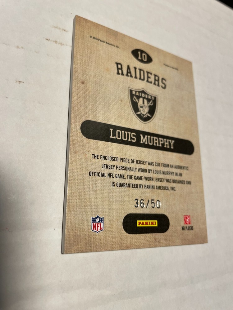 YOU ARE BIDDING ON A 2010 Panini Threads Game Day Jerseys Prime /50 Louis Murphy #10 🔥! !!!! !!! NO RESERVE GREAT PSA POTENTIAL!~ LOW OPENING BID! Stored in a temperature controlled/non-smoking environment for the last year. Any questions please ask, the cards appear to be in good condition/ please refer to the photos above. If your a NFL fan you will love this! Those with negative feed back need not bid. Check the photos as they reflect the overall good condition of this fantastic item, and check my feedback. What you see in the photos is what you get. Any questions, please ask before bidding NO refunds. You will not be disappointed. Your item will be securely packaged and sent. It will be in the mail within 24 hours of receiving payment. Happy bidding! Please be sure to check out our other items for other great Sports related items.