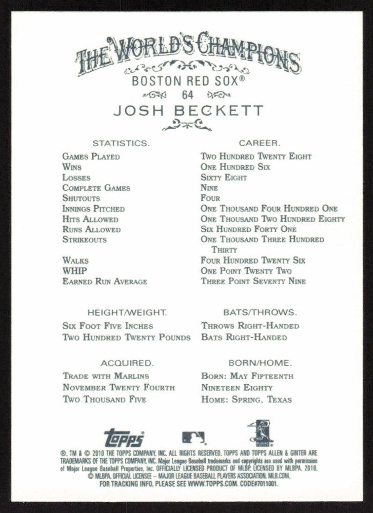 This is a nice example of a 2010 Topps Allen & Ginter #64 Josh Beckett Other important information about this card: In 2010 Josh Beckett played for the Boston Red Sox. Please check out our other listings for more great cards.
