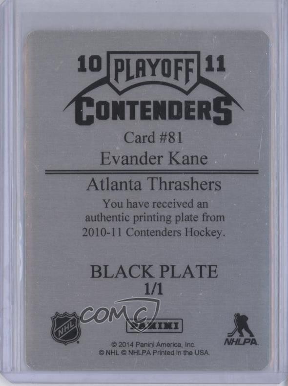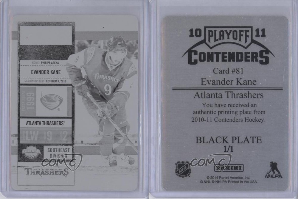 Parallel/Variety:Printing Plate BlackManufacturer:PaniniTeam:Atlanta ThrashersFeatures:Serial Numbered, One of One, Base Set, Parallel/VarietyPlayer/Athlete:Evander KaneLeague:National Hockey League (NHL)Sport:Ice Hockeybrand:PaniniSeries:Panini Playoff ContendersCard Number:81Season:2010-11Set:2010-11 Panini Playoff ContendersPrint Run:1