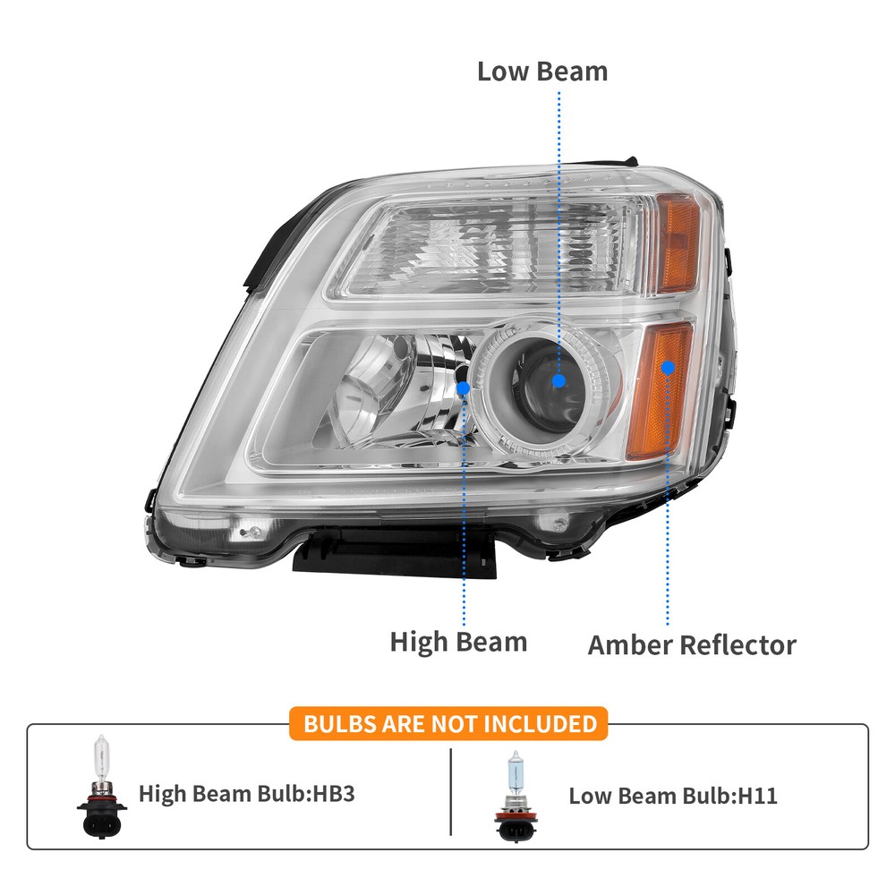 Item Description: - Condition: 100% Brand New and Never Used. - Made of materials that meet or exceed OEM requirements. - Color: Chrome Housing/Clear Lens - Bulb Type: HB3/H11 (Not Included) Package includes: - 1X Pair of Headlights (1x Driver's side & 1x passenger's sides),bulbs are Not included Vehicle Fitment: - For 2013-2015 GMC Terrain Denali - F or 2015 GMC Terrain SL - For 2010-2015 GMC Terrain SLE / SLT Note: 1. Professional installation is highly recommended, please contact us freely if you have any questions about installation. 2. Bulbs not included, use stock bulbs for installation. Shipping The shipping rates listed are only for residential or commercial destinations in the continental 48 United States. All international sales will go through eBay Global Shipping Program.Please ask us if there are any questions. We only ship the item to the address that is sent to us at the time of checkout. Please verify the correct shipping address in your PayPal account before making your payment. If we ship your item to an old or invalid address and you are not able to locate the item, we are not responsible for shipping a replacement. Currently, we do not ship to Hawaii, Alaska, Puerto Rico,APO/FPO/PO Boxes. We use USPS, UPS & FedEx as shipping method. Payments cleared before 12 PM PST, will be shipped on the same day. Payment We accept PayPal and all forms of credit card. We will only ship to the confirmed Paypal shipping address given with the payment. We do not offer local pick up service. Return 30 days Money Back Guarantee. If any package that needs to be returned, please contact our customer service first to receive a RMA form. All return items MUST be in brand new condition. About Us Specialized in aftermarket auto parts since 2012, we source and work directly with professional manufacturers to provide the highest quality parts at the most economical prices. We also has over 5 years of shipping experience with FedEx and USPS . Our packing quality is guarantee ,item shipping is timely! On Jul 9, 2023 at 20:53:38 PDT, seller added the following information: On Oct 9, 2023 at 19:46:35 PDT, seller added the following information: On Dec 17, 2024 at 23:03:21 PST, seller added the following information: