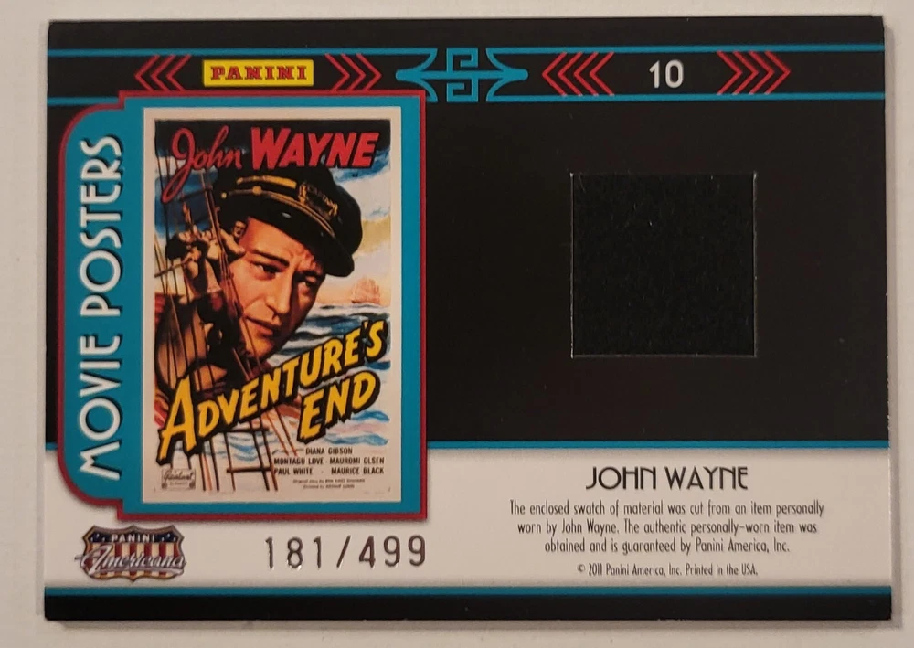 This is a 2011 Panini Americana Movie Posters trading card featuring John Wayne from the TV show "Adventure's End." It is a non-sport card with a movie worn relic from "Adventure's End." The card is serial numbered #181/499 and includes features like hologram, stamped, exclusive, and 1st edition. The card falls under the Film & TV Stars franchise and is ideal for collectors interested in Western, Action, and Adventure genres.