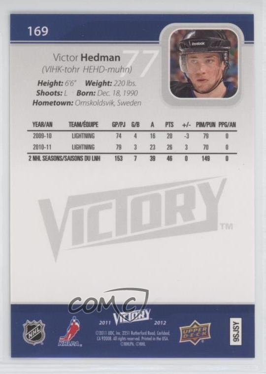 2011-12 Upper Deck Victory - [Base] - Black #169 Victor Hedman - Ice Hockey Card - Featuring the Tampa Bay Lightning - Featuring Victor Hedman Search for more: 2011-12 Upper Deck Victory Search for more: 2011-12 Upper Deck Victory - [Base] - Black View all of our Listings Auctions Buy It Now About Us Located in the beautiful Pacific Northwest, COMC (Check Out My Cards) is the world's largest consignment service for trading card singles. More than 10,000 people have used our consignment service to list over 50 million trading cards. Find out how we can help you consign your items on eBay by contacting us through eBay messaging. COMC -- "The Safe & Easy Way to Buy & Sell" Representative Image - Select Specific Item above to see image of actual item Representative Image - Select Specific Item above to see image of actual item Raw Condition for Modern Cards Unless otherwise noted, raw modern cards are listed in Near Mint-Mint condition or better. A NM-MT card appears to be Mint at first glance, but upon closer inspection, may exhibit some of the following: minor print defects (e.g. roller marks, print line, dimple), minor scratches, slight edge wear, and slight corner wear. Centering is clearly visible in the images provided and does not factor into our condition assessment. Raw Condition for Vintage Cards Unless otherwise noted, raw vintage cards are listed in Excellent condition or better. An EX card may exhibit some of the following: minor rounding of corners, surface wear, print defects, light scratches, and slight edge wear/chipping. Centering is clearly visible in the images provided and does not factor into our condition assessment. Domestic Shipping Combined shipping for multiple items is available. To receive combined shipping, please ensure all desired items are in your eBay shopping cart before proceeding to checkout. eBay limits orders to 40 items per order. We automatically combine multiple orders placed on the same day. If you place multiple orders on the same day, please contact us to request a refund of applicable shipping costs. Signature confirmation may be required on invoices over $400. All cards are protected and shipped securely. International Shipping COMC offers eBay's International Shipping (EIS) for international orders under $2,500* (see country exceptions below). All duties and import fees are paid at checkout; in the rare event that there are additional import fees upon delivery, these are borne by the buyer. EIS packages route through a shipping hub in Erlanger, KY before shipping to their final destination. Please note that EIS does not allow for combined shipments. The shipping rates are determined by eBay and cannot be adjusted. *Maximum sale price exceptions: Colombia, Kuwait ($2,000); Taiwan ($1,539); Chile, Costa Rica, Guatemala, Honduras, Trinidad and Tobago ($1,000); Antigua and Barbuda, Aruba, Belize, Dominica, Grenada, Philippines, Saint Kitts and Nevis, Saint Lucia, Montserrat, Turks and Caicos Islands ($500); Dominican Republic, El Salvador ($200). Please request a shipping quote through eBay messaging for orders that exceed the maximum sale price supported by eBay's International Shipping. You will be responsible for all duties and import fees for international orders shipped outside the EIS. All cards are protected and shipped securely. Payment COMC does not accept offers on our cards through our eBay storefront. COMC utilizes eBay’s managed payments system. If you are experiencing difficulties making a payment, please contact eBay for assistance. Return Policy Returns are only accepted on the rare occasion the item is not as described. If you are making a return, please initiate the return process through eBay so a mailing label can be provided for you. Prior to listing, our expert team carefully assessed this item to represent it accurately. Please review the description and high-definition images prior to purchasing to ensure this item meets your satisfaction. We welcome you to contact us if you have further questions about this item. Trust and Integrity COMC carefully assesses each item consigned to us to prevent fraudulent items from entering the marketplace. If you believe an item offered on COMC may be fraudulent, please contact us with details so we can investigate the issue. Items we determine are outside our supported items policy may be removed. Last Modified: 6/7/2025 8:23:21 AM PDT