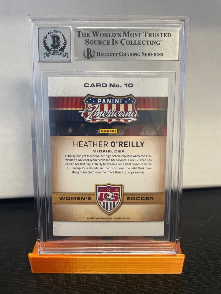 2012 AMERICANA HEROES & LEGENDS USWNT - HEATHER O'REILLY - SIGNED BECKETT CERTIFIED AUTO 10. You are bidding on a signed card of Heather O'Reilly. The card has been certified as authentic by Beckett Authentication Services, with a Perfect 10 AUTO Grade. Card is sealed and encapsulated by Beckett. Slab will be sent in a bubble mailer to ensure that it arrives to you with no damage. Buyer to pay $9.85 for Priority Mail Shipping in the US. Thanks for bidding!! MJ
