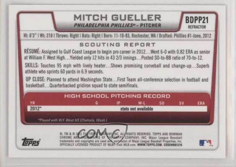 2012 Bowman Draft Picks & Prospects - Chrome Draft Picks - Refractor #BDPP21 Mitch Gueller - Rookie - Baseball Card - Featuring the Philadelphia Phillies - Featuring Mitch Gueller Search for more: 2012 Bowman Draft Picks & Prospects Search for more: 2012 Bowman Draft Picks & Prospects - Chrome Draft Picks - Refractor View all of our Listings Auctions Buy It Now About Us Located in the beautiful Pacific Northwest, COMC (Check Out My Cards) is the world's largest consignment service for trading card singles. More than 10,000 people have used our consignment service to list over 50 million trading cards. Find out how we can help you consign your items on eBay by contacting us through eBay messaging. COMC -- "The Safe & Easy Way to Buy & Sell" Representative Image - Select Specific Item above to see image of actual item Representative Image - Select Specific Item above to see image of actual item Raw Condition for Modern Cards Unless otherwise noted, raw modern cards are listed in Near Mint-Mint condition or better. A NM-MT card appears to be Mint at first glance, but upon closer inspection, may exhibit some of the following: minor print defects (e.g. roller marks, print line, dimple), minor scratches, slight edge wear, and slight corner wear. Centering is clearly visible in the images provided and does not factor into our condition assessment. Raw Condition for Vintage Cards Unless otherwise noted, raw vintage cards are listed in Excellent condition or better. An EX card may exhibit some of the following: minor rounding of corners, surface wear, print defects, light scratches, and slight edge wear/chipping. Centering is clearly visible in the images provided and does not factor into our condition assessment. Domestic Shipping Combined shipping for multiple items is available. To receive combined shipping, please ensure all desired items are in your eBay shopping cart before proceeding to checkout. eBay limits orders to 40 items per order. We automatically combine multiple orders placed on the same day. If you place multiple orders on the same day, please contact us to request a refund of applicable shipping costs. Signature confirmation may be required on invoices over $400. All cards are protected and shipped securely. International Shipping COMC offers eBay's International Shipping (EIS) for international orders under $2,500* (see country exceptions below). All duties and import fees are paid at checkout; in the rare event that there are additional import fees upon delivery, these are borne by the buyer. EIS packages route through a shipping hub in Erlanger, KY before shipping to their final destination. Please note that EIS does not allow for combined shipments. The shipping rates are determined by eBay and cannot be adjusted. *Maximum sale price exceptions: Colombia, Kuwait ($2,000); Taiwan ($1,539); Chile, Costa Rica, Guatemala, Honduras, Trinidad and Tobago ($1,000); Antigua and Barbuda, Aruba, Belize, Dominica, Grenada, Philippines, Saint Kitts and Nevis, Saint Lucia, Montserrat, Turks and Caicos Islands ($500); Dominican Republic, El Salvador ($200). Please request a shipping quote through eBay messaging for orders that exceed the maximum sale price supported by eBay's International Shipping. You will be responsible for all duties and import fees for international orders shipped outside the EIS. All cards are protected and shipped securely. Payment COMC does not accept offers on our cards through our eBay storefront. COMC utilizes eBay’s managed payments system. If you are experiencing difficulties making a payment, please contact eBay for assistance. Return Policy Returns are only accepted on the rare occasion the item is not as described. If you are making a return, please initiate the return process through eBay so a mailing label can be provided for you. Prior to listing, our expert team carefully assessed this item to represent it accurately. Please review the description and high-definition images prior to purchasing to ensure this item meets your satisfaction. We welcome you to contact us if you have further questions about this item. Trust and Integrity COMC carefully assesses each item consigned to us to prevent fraudulent items from entering the marketplace. If you believe an item offered on COMC may be fraudulent, please contact us with details so we can investigate the issue. Items we determine are outside our supported items policy may be removed. Last Modified: 1/30/2025 5:10:08 PM PDT