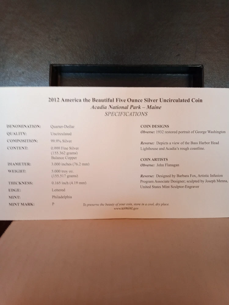Circulated/Uncirculated:UncirculatedCertification:UncertifiedFineness:0.999Variety:AcadiaDenomination:25CCoin:America the BeautifulYear:2012Mint Location:PhiladelphiaCountry/Region of Manufacture:United StatesComposition:SilverGrade:UngradedStrike Type:Business