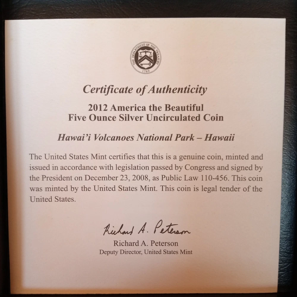 2012 P - Hawaii Volcanoes National Park - 5 oz Silver - Mint Box & COA - .999 Fine - NQ 3. Shipped with USPS Ground Advantage.