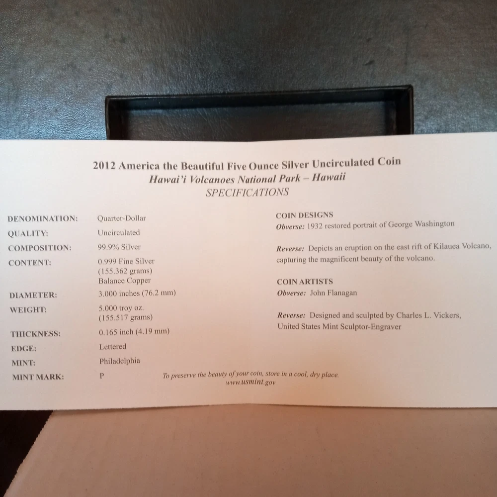 2012 P - Hawaii Volcanoes Park - 5 oz Silver Coin - Mint Box & COA - .999 - ATB