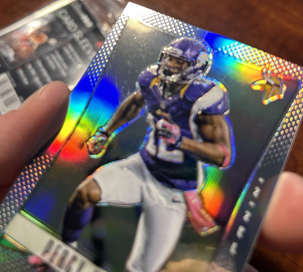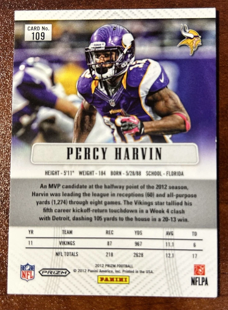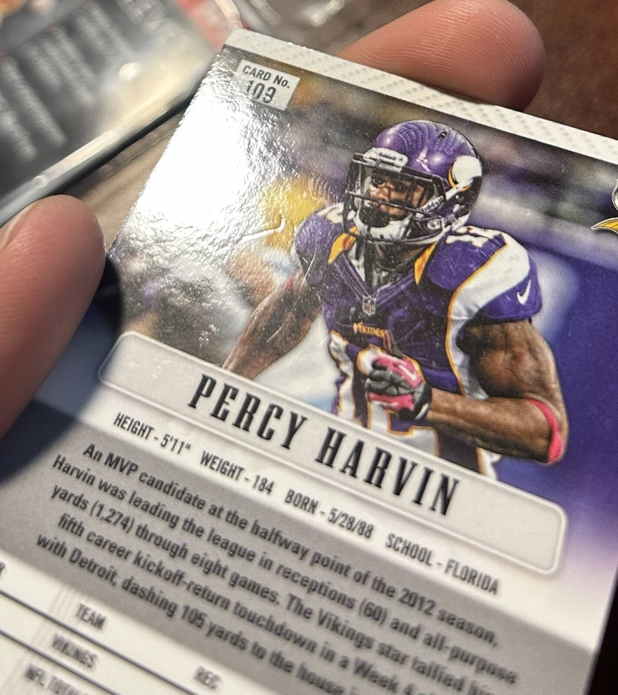 This card is a beautiful and rare care of the electric Percy Harvin. It is the first year of the most collectible set of the 2010s and is a silver Prizm. This card has some scratching on the front consistent with the cards age and you can see the condition there.