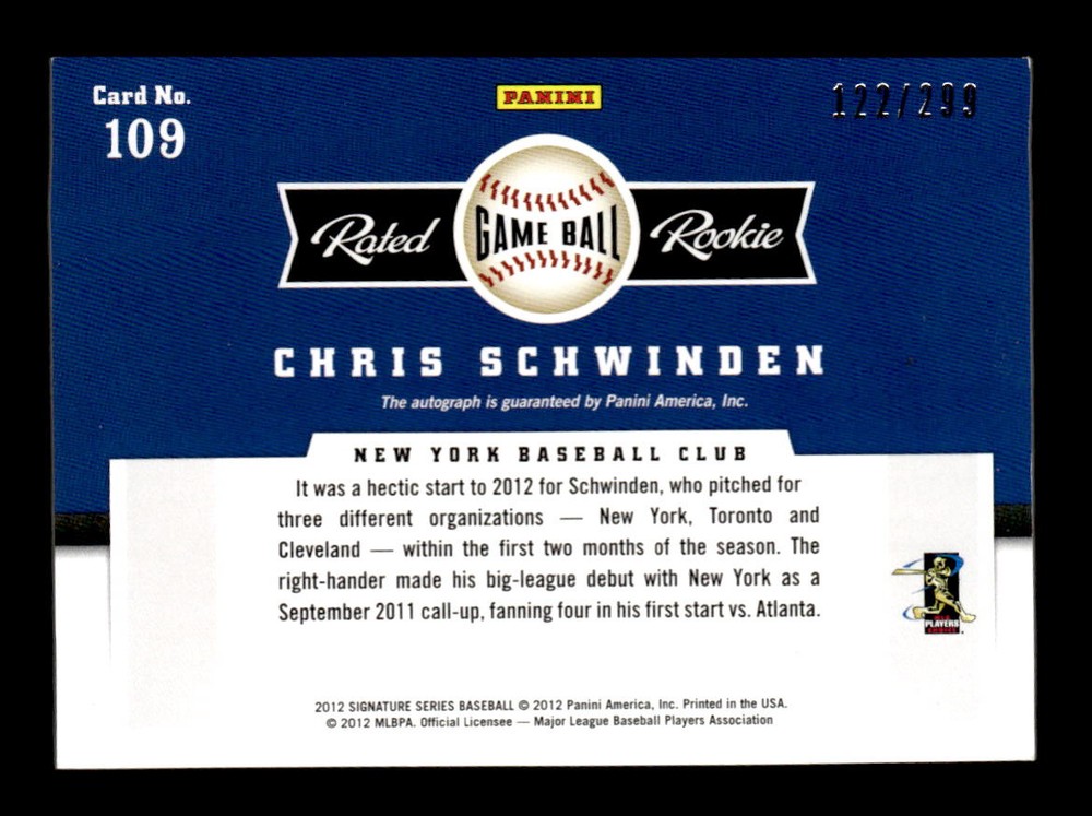 2012 Panini Signature Series Chris Schwinden Rookies Game Ball Autograph /299