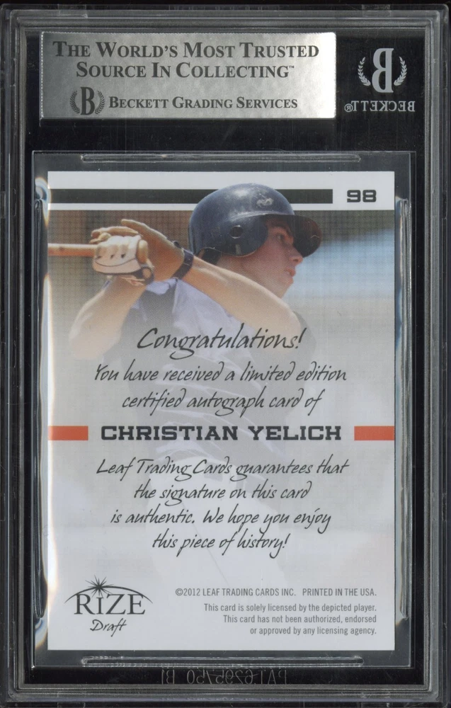 You are purchasing a 2012 Rize Draft Autographs Red Christian Yelich #98 BGS 0. You will receive the exact item in the photographs. Thank you for looking. Listed With Mascot .