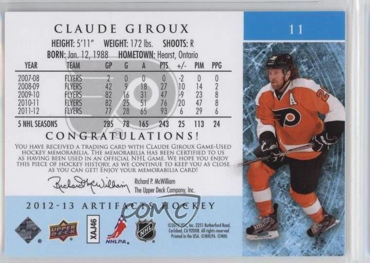 2012-13 Upper Deck Artifacts - [Base] - Jersey/Jersey #11 Claude Giroux Qty Made: 125 - Ice Hockey Card - Featuring the Philadelphia Flyers - Featuring Claude Giroux Search for more: 2012-13 Upper Deck Artifacts Search for more: 2012-13 Upper Deck Artifacts - [Base] - Jersey/Jersey View all of our Listings Auctions Buy It Now About Us Located in the beautiful Pacific Northwest, COMC (Check Out My Cards) is the world's largest consignment service for trading card singles. More than 10,000 people have used our consignment service to list over 50 million trading cards. We currently house 20 million cards, each listed for sale with front and back images of the actual card. Find out how we can help you consign your items on eBay by contacting us through eBay messaging. COMC -- "The Safe & Easy Way to Buy & Sell" Representative Image - Select Specific Item above to see image of actual item Representative Image - Select Specific Item above to see image of actual item Raw Condition for Modern Cards Unless otherwise noted, raw modern cards are listed in Near Mint-Mint condition or better. A NM-MT card appears to be Mint at first glance, but upon closer inspection, may exhibit some of the following: minor print defects (e.g. roller marks, print line, dimple), minor scratches, slight edge wear, and slight corner wear. Centering is clearly visible in the images provided and does not factor into our condition assessment. Raw Condition for Vintage Cards Unless otherwise noted, raw vintage cards are listed in Excellent condition or better. An EX card may exhibit some of the following: minor rounding of corners, surface wear, print defects, light scratches, and slight edge wear/chipping. Centering is clearly visible in the images provided and does not factor into our condition assessment. Domestic Shipping Combined shipping for multiple items is available. To receive combined shipping, please ensure all desired items are in your eBay shopping cart before proceeding to checkout. eBay limits orders to 40 items per order. We automatically combine multiple orders placed on the same day. If you place multiple orders on the same day, please contact us to request a refund of applicable shipping costs. Signature confirmation may be required on invoices over $400. Raw cards are shipped in toploaders. International Shipping COMC offers eBay's International Shipping (EIS) for international orders under $2,500* (see country exceptions below). All duties and import fees are paid at checkout; in the rare event that there are additional import fees upon delivery, these are borne by the buyer. EIS packages route through a shipping hub in Erlanger, KY before shipping to their final destination. Please note that EIS does not allow for combined shipments. The shipping rates are determined by eBay and cannot be adjusted. *Maximum sale price exceptions: Colombia, Kuwait ($2,000); Taiwan ($1,539); Chile, Costa Rica, Guatemala, Honduras, Trinidad and Tobago ($1,000); Antigua and Barbuda, Aruba, Belize, Dominica, Grenada, Philippines, Saint Kitts and Nevis, Saint Lucia, Montserrat, Turks and Caicos Islands ($500); Dominican Republic, El Salvador ($200). Please request a shipping quote through eBay messaging for orders that exceed the maximum sale price supported by eBay's International Shipping. You will be responsible for all duties and import fees for international orders shipped outside the EIS. Raw cards are shipped in toploaders. Payment COMC does not accept offers on our cards through our eBay storefront. COMC utilizes eBay’s managed payments system. If you are experiencing difficulties making a payment, please contact eBay for assistance. Return Policy Returns are only accepted on the rare occasion the item is not as described. If you are making a return, please initiate the return process through eBay so a mailing label can be provided for you. Prior to listing, our expert team carefully assessed this item to represent it accurately. Please review the description and high-definition images prior to purchasing to ensure this item meets your satisfaction. We welcome you to contact us if you have further questions about this item. Trust and Integrity COMC carefully assesses each item consigned to us to prevent fraudulent items from entering the marketplace. If you believe an item offered on COMC may be fraudulent, please contact us with details so we can investigate the issue. Items we determine are outside our supported items policy may be removed. Last Modified: 12/30/2024 7:50:36 PM PDT