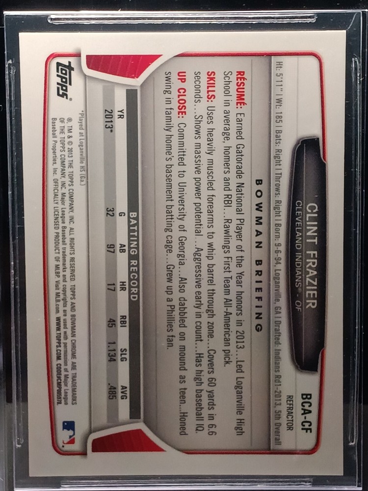 Up for sale is a 2013 Bowman Chrome Clint Frazier Refractor Prospect Auto #BCA-CF BGS 9.5 Auto 10 trading card. This card features a hard-signed autograph by Clint Frazier himself and is authenticated by Beckett Authentication Services (BAS). The card is an original and comes from the 2013 Bowman Chrome set, with a card thickness of 35 Pt. This card is a must-have for any baseball fan and collector, especially those who support the Cleveland Indians or Guardians. With its short print, parallel/variety, autograph, and insert features, this card is a rare gem that is sure to stand out in any collection. Don't miss your chance to own this one-of-a-kind card!