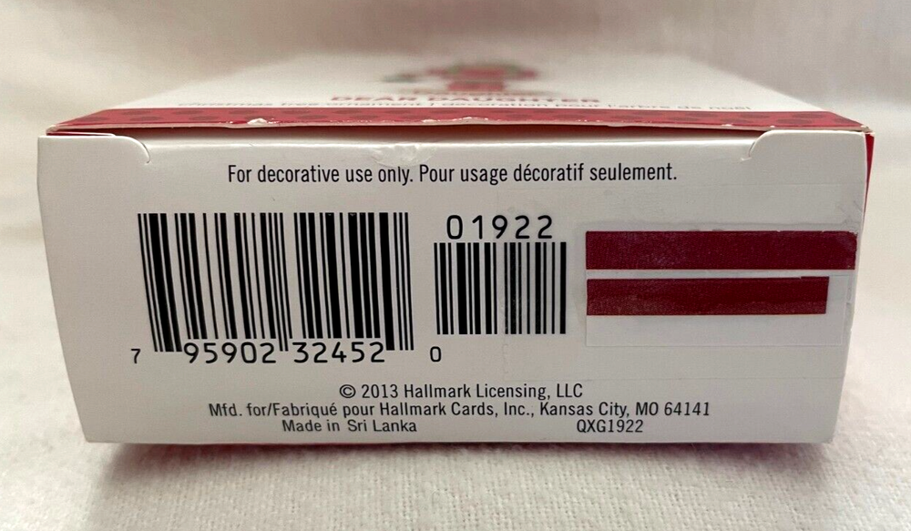 Number of Items: 1 UPC: 795902324520 2013 DEAR DAUGHTER ORNAMENT: HALLMARK KEEPSAKE TREE ORNAMENT FOR DAUGHTER Year Manufactured: 2013 Theme: Christmas Subject: Daughter Occasion: Christmas MPN: QXG1922 Vintage: No Brand: Hallmark Country/Region of Manufacture: Sri Lanka Collection: Ornaments Color: Multicolor Type: Ornament Franchise: HALLMARK Original/Licensed Reproduction: Original Recipient: Daughter Modified Item: No Time Period Manufactured: 2010-2019 gtin13: 795902324520