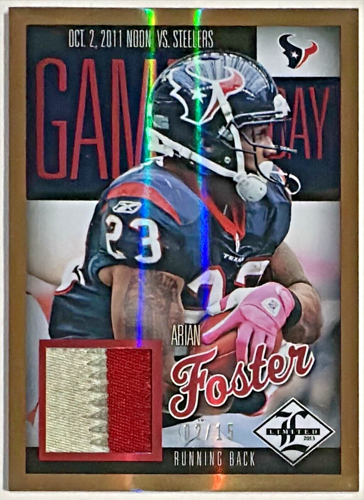 Thank you for checking out this listing. For sale is a Prime Parallel Game Day Materials card of Arian Foster from 2013 Panini Limited, serial numbered 2/15 and featuring Dirty Patch worn in the Texans October 2, 2011 Game vs. the Steelers. I don't use stock photos for my listings - the card in the photos is the actual one for sale. I do offer combined shipping and any additional cards are $0.25 each. If you're interested in buying multiple items and the combined shipping discount doesn't appear automatically or won't work because of auto pay, let me know - I'm happy to work with you. The card will be carefully packaged with tracking. Items are usually shipped within 1 business day of receiving payment.