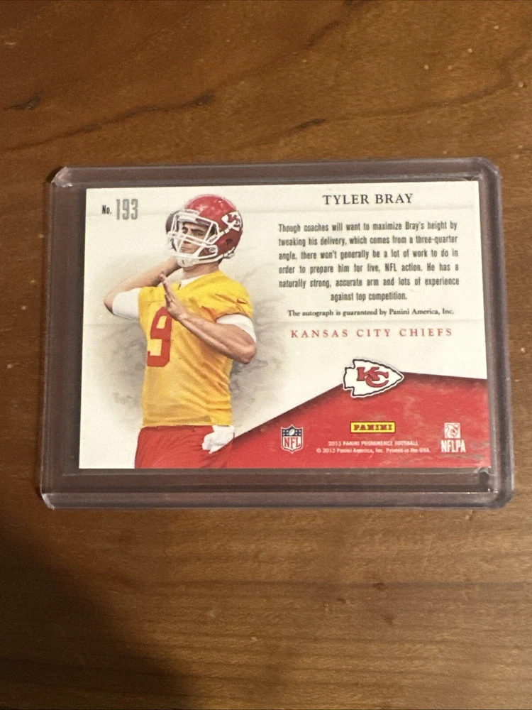 Set: 2013 Panini Prominence Sport: Football Features: Serial Numbered, Parallel/Variety, Base Set, Rookie Print Run: 100 Manufacturer: Panini Card Number: 193 Parallel/Variety: Rookie Helmet Signatures Season: 2013 Type: Sports Trading Card League: National Football League (NFL) Team: Kansas City Chiefs Player/Athlete: Tyler Bray