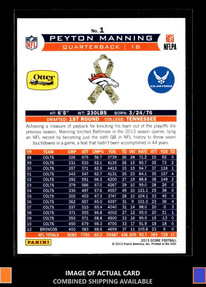 Set: 2013 Score Denver Broncos Year Manufactured: 2013 Season: 2013 Type: Sports Trading Card Card Number: 1 Sport: FOOTBALL League: NFL Team: Denver Broncos Manufacturer: Score Graded: No Autographed: No Player/Athlete: Peyton Manning