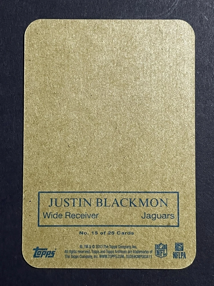 Original/Licensed Reprint: Original Country/Region of Manufacture: United States Sport: Football Material: Card Stock Set: 2013 Topps Archives Language: English Autographed: No Team: Miami Dolphins, Buffalo Bills, New York Jets, Denver Broncos, New England Patriots, Kansas City Chiefs, Oakland Raiders, San Diego Chargers, Indianapolis Colts, Jacksonville Jaguars, Cincinnati Bengals, Pittsburgh Steelers, Cleveland Browns, Dallas Cowboys, New York Giants, Philadelphia Eagles, Washington Commanders, Tampa Bay Buccaneers, Atlanta Falcons, Carolina Panthers, San Francisco 49ers, Seattle Seahawks, Arizona Cardinals, Los Angeles Rams, Green Bay Packers, Detroit Lions, Minnesota Vikings, Chicago Bears Manufacturer: Topps Season: 2012 Card Size: Standard Player/Athlete: Justin Blackmon Type: Sports Trading Card Parallel/Variety: Glossy League: National Football League (NFL)