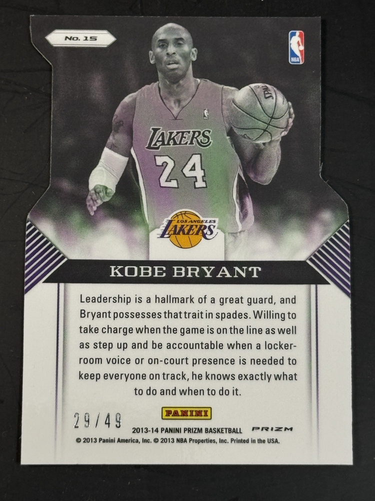 ******************************** 2013-14 Panini Prizm Guard Duty Insert KOBE BRYANT Light Purple Die-Cut 29/49 ๐บ๐ธ ******************************** Please see photos for details. What you see is exactly what you will receive. Many other rare spoprtscards available. Should you have any issues or concerns with the item you purchase please contact us immediately and we will do all we can to address your concern. We have many more cool collectibles such as Trading Cards, Comics, Action Figures, Diecast Models, Model Trains & Accessories, Sports Cards/Memorabilia, Bobbleheads, Hess Trucks, Unique DVDs and more currently listed in our eBay Store. Take advantage of current discounts and promos, and save big on your purchase. You can even save on shipping! We have been selling on eBay for over 20 Years, and we ALWAYS put the customer first. Once you make a purchase, we make sure it goes out safely the next business day. We also respond to all messages and take care of any issues that may arise. Buy from a Pro - We thank you for shopping with us!