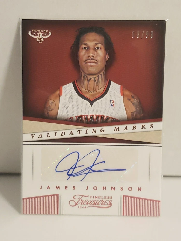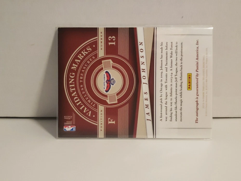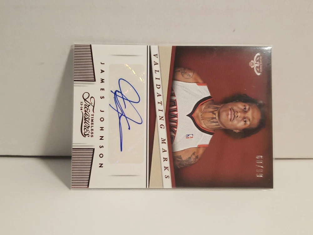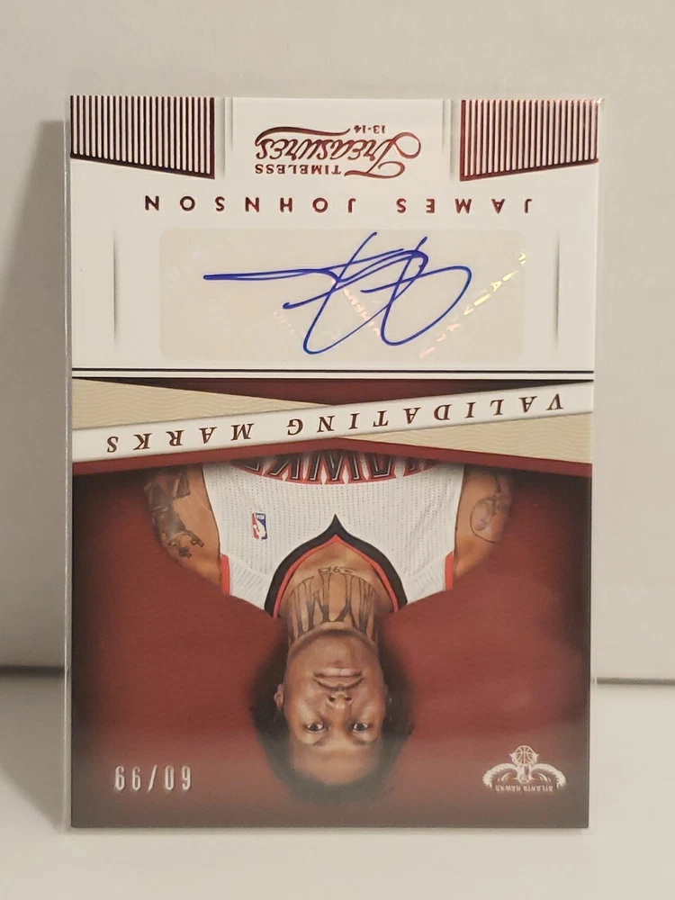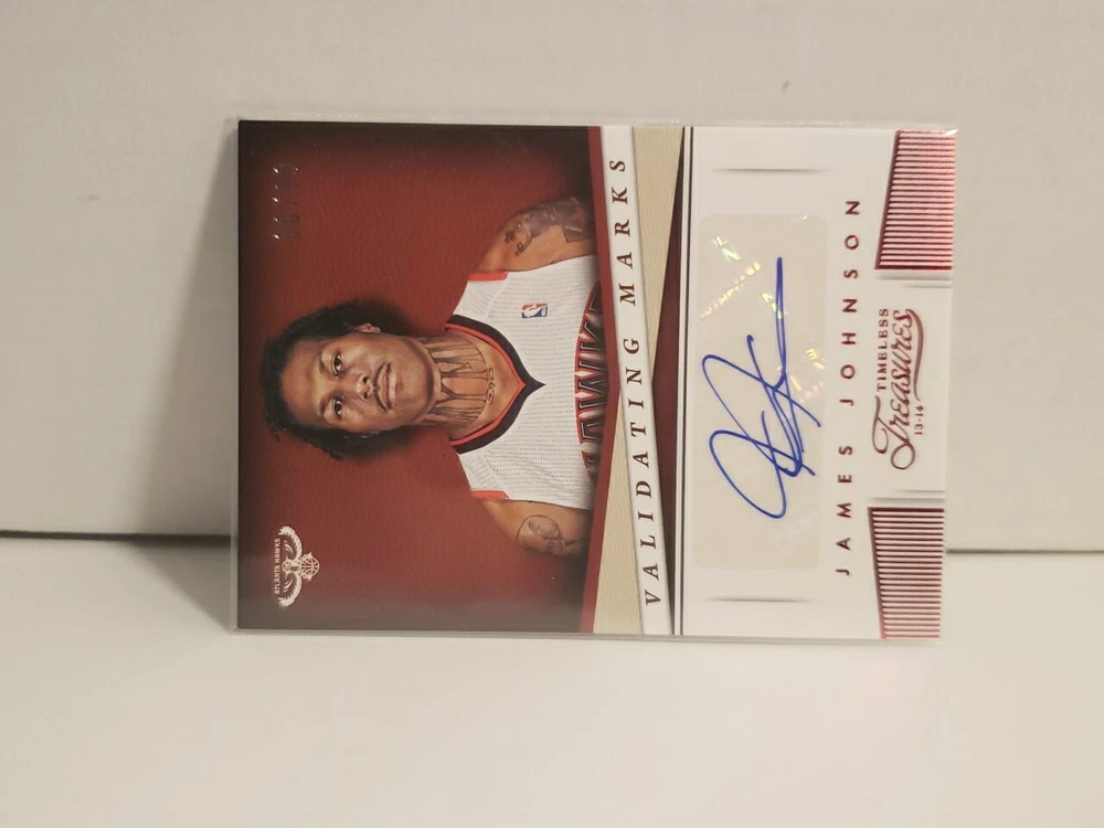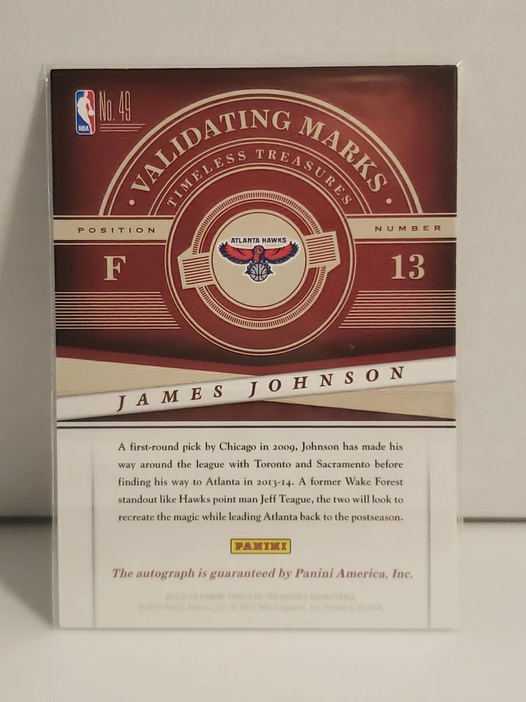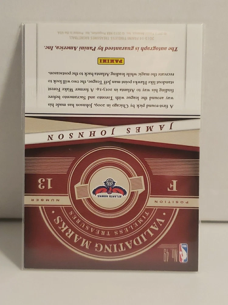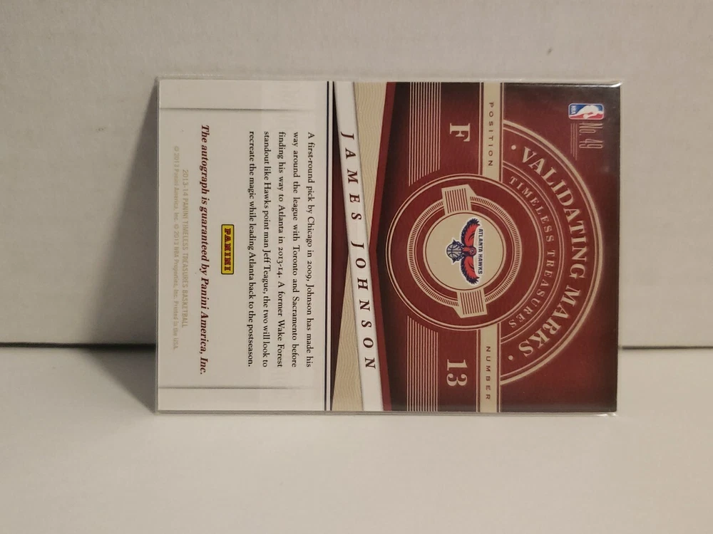 2013-14 Panini Timeless Treasures Validating Marks Ruby #49 James Johnson 60/99. Condition is "Very Good". Shipped with USPS Gound Advantage Due to my schedule The Post Office is close before I head to work and close when I get off work Sunday - Friday I'm only able to go to the Post Office Saturday, but I sometimes get off early so if payment is not received by night before they won't be shipped until the following off day so for any delay of shipping i will try my best to get it off on time I'm not a professional grader...... The majority of my cards are packed fresh open by myself, however I've bought many cards over the years to build my sets. I bought cards from card shops, card shows, Instagram, and even eBay to add to my collection. Now my collection to me isn't what it used to be, so I'm slowly getting rid of my collection. If you're looking for cards let me know I have thousands. I didn't check every card for flaws, my feedback speaks for itself on my other pages. I use the term VERY GOOD good to cover myself LOOK AT THE THE PICTURES. And for everyone who expects every card to be a mint 9 or 10 very good. It could have a ding here or a rough corner there, ask for pics What U See Is What U Get. Additional cards will be $1 Wait for invoice if not I will not give discount If you are looking for other cards hit me up, I have singles, Rookies , Jersey's , Auto's , Numbered, some sets i have a lot. Thank you, if you have any questions just ask. Good luck.