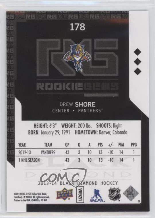 2013-14 Upper Deck Black Diamond - [Base] #178 Rookie Gems - Drew Shore - RC (Rookie Card) - Ice Hockey Card - Featuring the Florida Panthers - Featuring Drew Shore Search for more: 2013-14 Upper Deck Black Diamond Search for more: 2013-14 Upper Deck Black Diamond - [Base] View all of our Listings Auctions Buy It Now About Us Located in the beautiful Pacific Northwest, COMC (Check Out My Cards) is the world's largest consignment service for trading card singles. More than 10,000 people have used our consignment service to list over 50 million trading cards. Find out how we can help you consign your items on eBay by contacting us through eBay messaging. COMC -- "The Safe & Easy Way to Buy & Sell" Representative Image - Select Specific Item above to see image of actual item Representative Image - Select Specific Item above to see image of actual item Raw Condition for Modern Cards Unless otherwise noted, raw modern cards are listed in Near Mint-Mint condition or better. A NM-MT card appears to be Mint at first glance, but upon closer inspection, may exhibit some of the following: minor print defects (e.g. roller marks, print line, dimple), minor scratches, slight edge wear, and slight corner wear. Centering is clearly visible in the images provided and does not factor into our condition assessment. Raw Condition for Vintage Cards Unless otherwise noted, raw vintage cards are listed in Excellent condition or better. An EX card may exhibit some of the following: minor rounding of corners, surface wear, print defects, light scratches, and slight edge wear/chipping. Centering is clearly visible in the images provided and does not factor into our condition assessment. Domestic Shipping Combined shipping for multiple items is available. To receive combined shipping, please ensure all desired items are in your eBay shopping cart before proceeding to checkout. eBay limits orders to 40 items per order. We automatically combine multiple orders placed on the same day. If you place multiple orders on the same day, please contact us to request a refund of applicable shipping costs. Signature confirmation may be required on invoices over $400. All cards are protected and shipped securely. International Shipping COMC offers eBay's International Shipping (EIS) for international orders under $2,500* (see country exceptions below). All duties and import fees are paid at checkout; in the rare event that there are additional import fees upon delivery, these are borne by the buyer. EIS packages route through a shipping hub in Erlanger, KY before shipping to their final destination. Please note that EIS does not allow for combined shipments. The shipping rates are determined by eBay and cannot be adjusted. *Maximum sale price exceptions: Colombia, Kuwait ($2,000); Taiwan ($1,539); Chile, Costa Rica, Guatemala, Honduras, Trinidad and Tobago ($1,000); Antigua and Barbuda, Aruba, Belize, Dominica, Grenada, Philippines, Saint Kitts and Nevis, Saint Lucia, Montserrat, Turks and Caicos Islands ($500); Dominican Republic, El Salvador ($200). Please request a shipping quote through eBay messaging for orders that exceed the maximum sale price supported by eBay's International Shipping. You will be responsible for all duties and import fees for international orders shipped outside the EIS. All cards are protected and shipped securely. Payment COMC does not accept offers on our cards through our eBay storefront. COMC utilizes eBay’s managed payments system. If you are experiencing difficulties making a payment, please contact eBay for assistance. Return Policy Returns are only accepted on the rare occasion the item is not as described. If you are making a return, please initiate the return process through eBay so a mailing label can be provided for you. Prior to listing, our expert team carefully assessed this item to represent it accurately. Please review the description and high-definition images prior to purchasing to ensure this item meets your satisfaction. We welcome you to contact us if you have further questions about this item. Trust and Integrity COMC carefully assesses each item consigned to us to prevent fraudulent items from entering the marketplace. If you believe an item offered on COMC may be fraudulent, please contact us with details so we can investigate the issue. Items we determine are outside our supported items policy may be removed. Last Modified: 2/13/2025 12:59:27 AM PDT