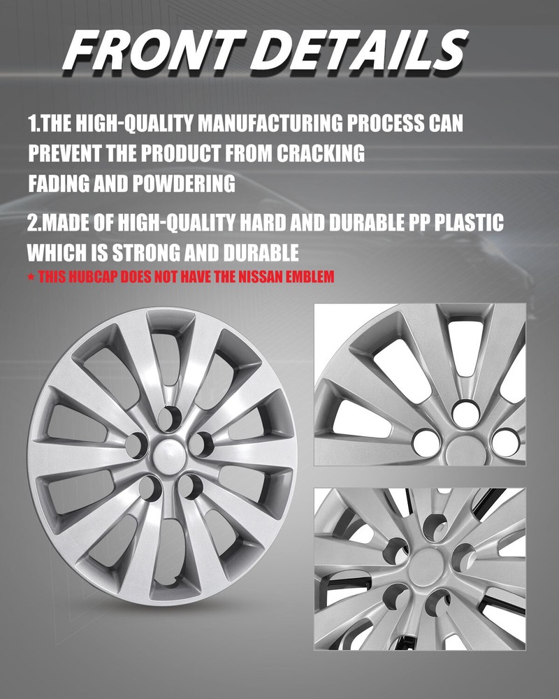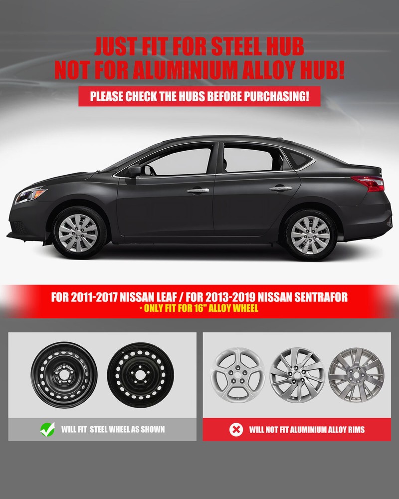 Store Categories Other Car Refrigerator Front Bumper Rear Bumper Fender Flares Inner Fenders Side Steps Running Board A-Pillar Light Mount Brackets Headlights Taillights Fog Lights LED Headlights LED Taillights LED Fog Lights Jeep Chevrolet Ford Toyota Dodge GMC Wheel Covers Features ✴ PERFECT FIT: This wheel hub cap is specifically designed to perfectly fit for 16-inch wheels, ensuring a seamless match and enhanced aesthetics. It complements the overall design of the vehicle, elevating its visual appeal. ✴ HIGH-QUALITY MATERIAL: Constructed from high-quality materials, this wheel hub cap guarantees durability and longevity. It withstands various road conditions and environmental factors encountered during daily driving, maintaining its pristine condition. ✴ EASY INSTALLATION: Installing this wheel hub cap is a breeze and requires no specialized tools or modifications. It comes with a user-friendly system, allowing for a hassle-free installation process by following the provided instructions. ✴ PROTECTIVE FUNCTION: Besides its aesthetic appeal, this wheel hub cap serves as a protective barrier for the wheels. It prevents scratches and potential damage caused by stones, debris, or other objects, safeguarding the wheel's surface. ✴ AFTER-SALES SERVICE: If There Is a Loss of Product Parts, or Any Parts of The Problem, We Can Provide After-Sales Service, Please Contact Us on The Order Page. Wheel Covers Specification ✴ Type: Hub caps ✴ Number in Pack: 4 ✴ Color: Silver Lacquer ✴ Material: PP ✴ Compatible Wheel Diameter: 16 in ✴ Finish: Glossy ✴ Installation Type: Snap-On ✴ Model: For 2013-2019 Nissan Sentra/For 2011-2017 Nissan Leaf Wheel Covers Package ✴ 1 Set of 4 Hub caps and 4 retention rings Payment Delivery details Terms of sales About us Contact us Payment We accept PayPal, credit card , Apple Pay & Google Pay etc. Delivery details All items will be shipped within 1-3 business days after payment received, we will try our best to ship out as soon as we can, hope for your understanding. Please double confirm your address and contact information, which will help the delivery faster and more accurately. Note :buyers who purchase international products need to pay import tariffs!!! Terms of sales Professional installation is highly recommended. Any problem of the item please feel free to contact us first , please D o Not leave negative feedback before that, or simply return it within 60 Days in original condition. We will resolve it for you ASAP. About us Any questions please do not hesitate to contact us directly by eBay message . We will reply you within 24 hours asap, thanks for your understanding. Contact us Should you have any problem or require any further information please feel free to contact us . If you are satisfied with our product and service, please kindly leave us a positive feedback. Popular Categories On Jun 12, 2025 at 12:15:06 PDT, seller added the following information: