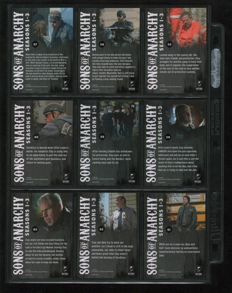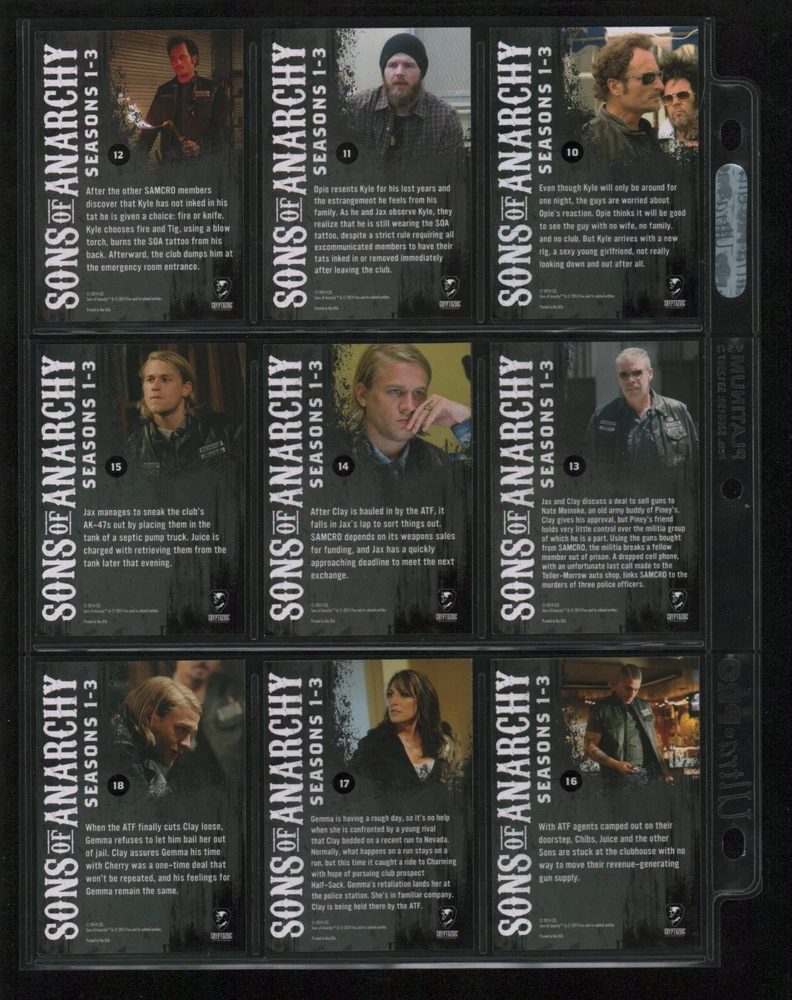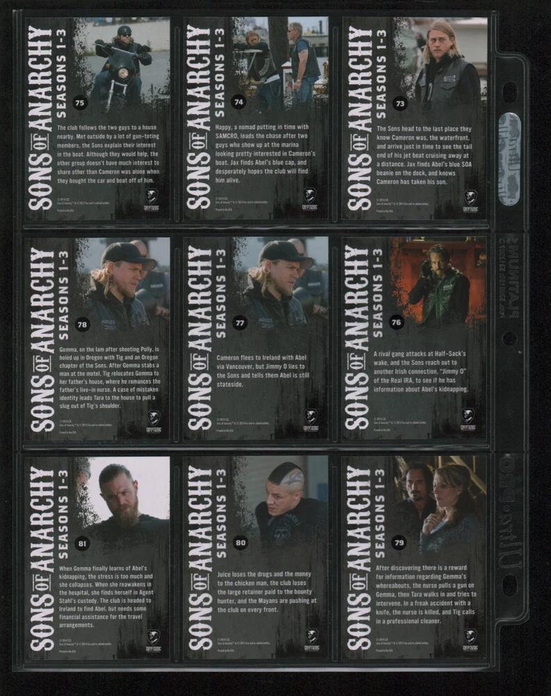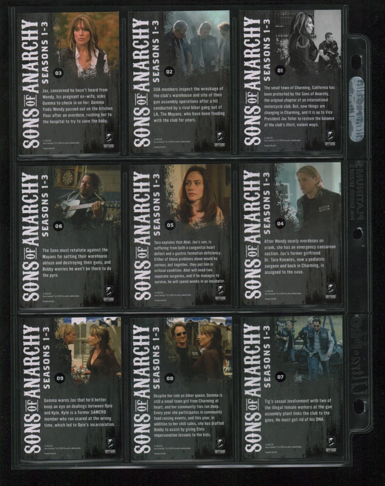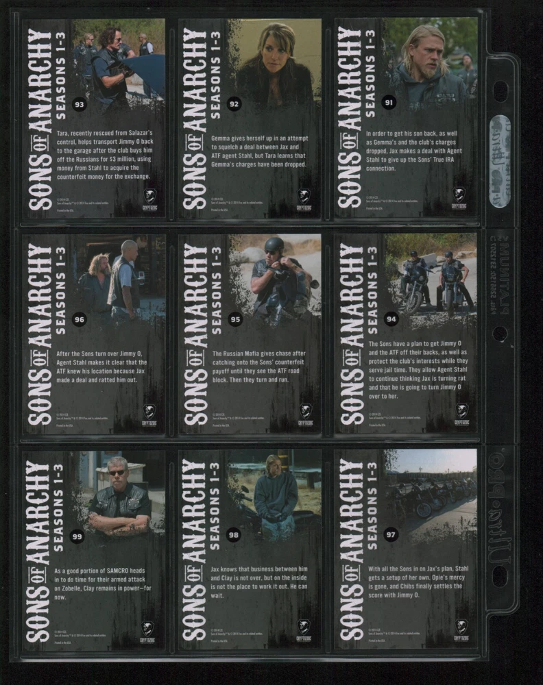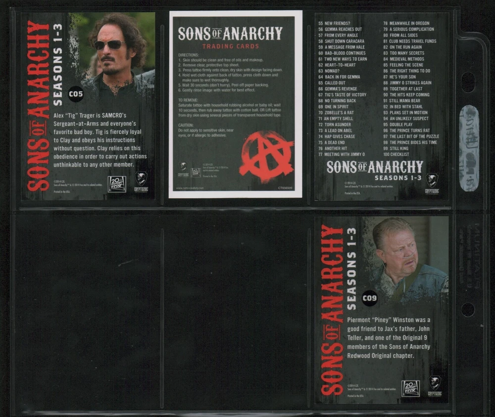 ITEM DESCRIPTION : 2014 Cryptozoic Sons of Anarchy Seasons 1-3 Base Set 1-100 + Character Bios #C05 & #C09 + Temporary Tattoo #TT-06 . See photos for details. IMAGINAIRE STORE: Formerly Simon Bourque Sports Cards. Since 1988, Imaginaire specializes in trading cards, stamps, collectibles, and memorabilia . SHIPPING COSTS: Combine items and save on shipping costs. Price varies depending on the size and weight of the parcel. Please note that all packages over $100 will be automatically sent via registered postal service with tracking number. NOTICE INFORMATION: PLEASE NOTE that p ayment must be received within 7 business days of the end of auction, unless prior arrangements have been made. Item(s) will be shipped within 2 business days. If you have any questions, please email us.