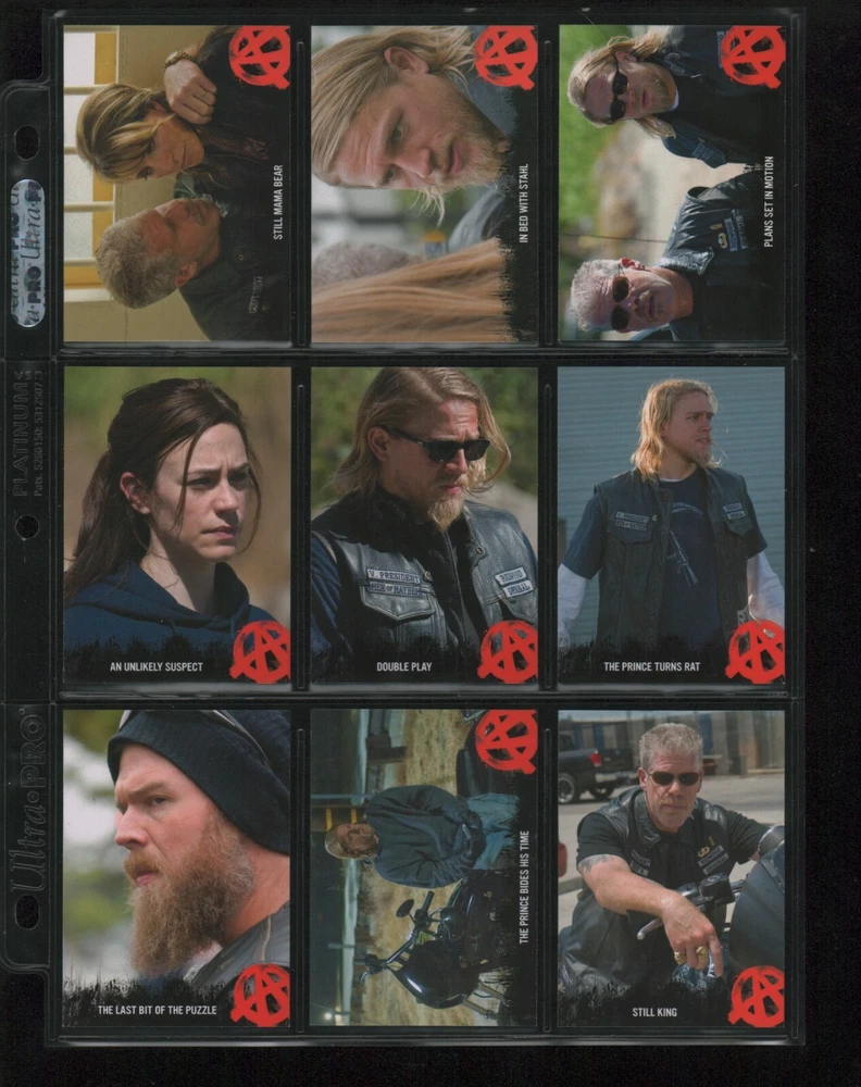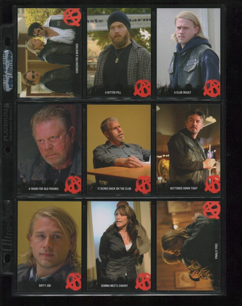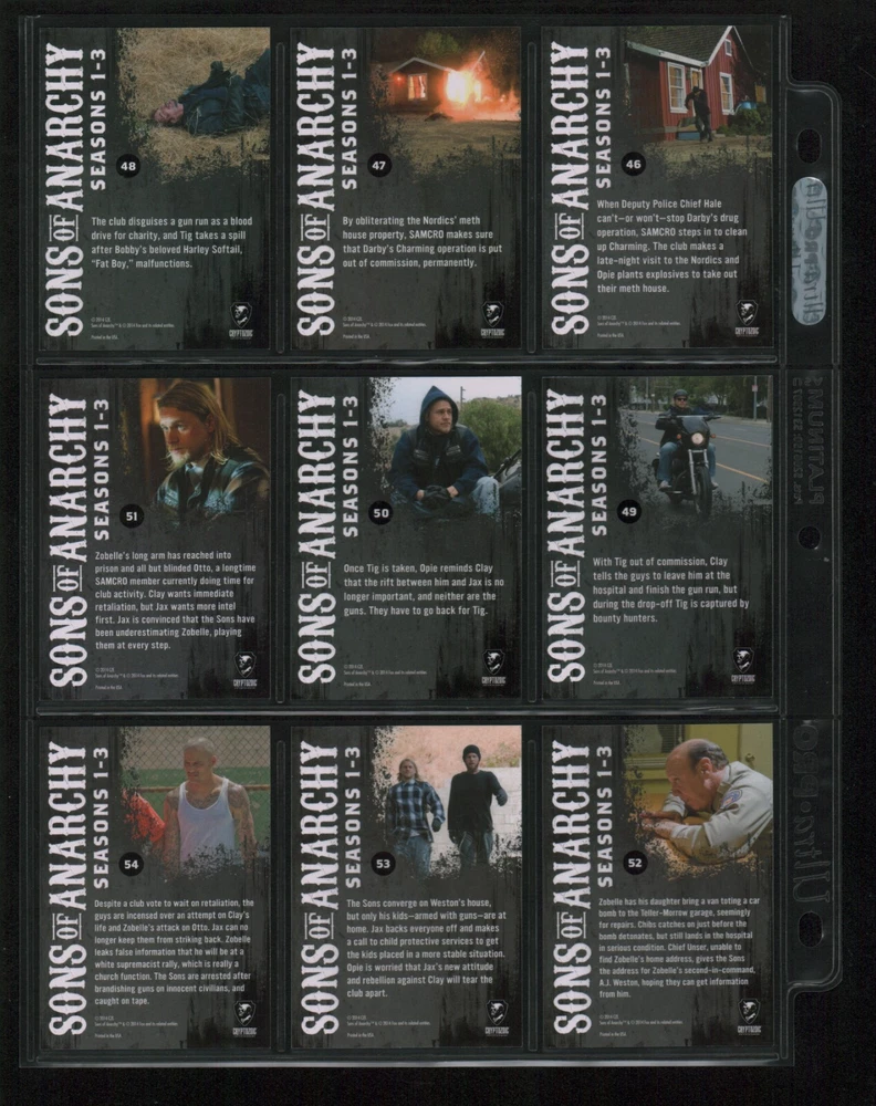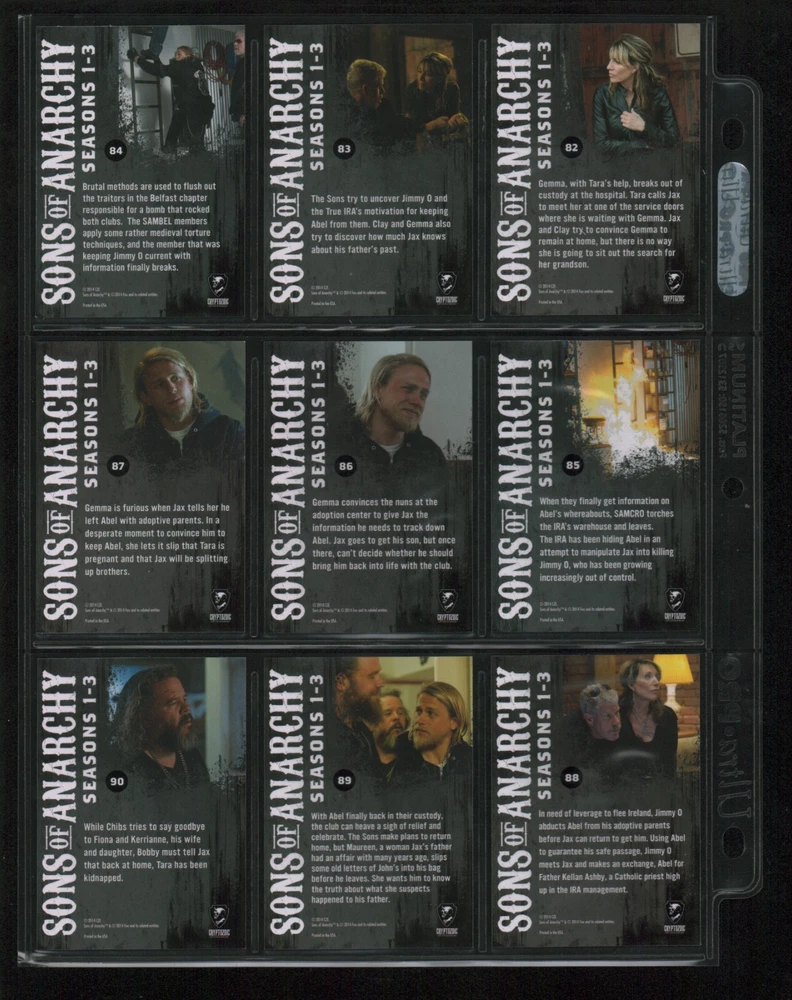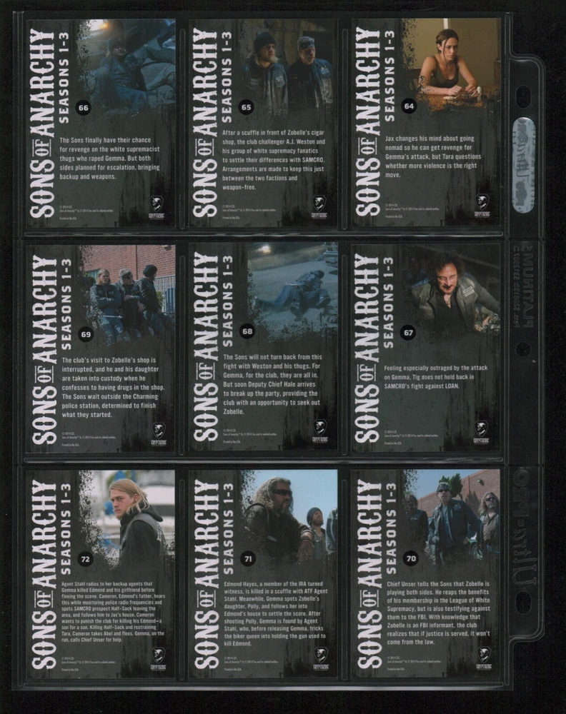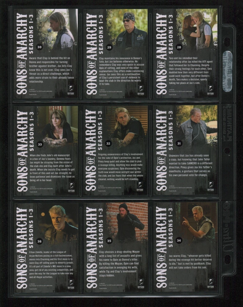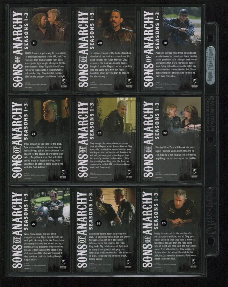 ITEM DESCRIPTION : 2014 Cryptozoic Sons of Anarchy Seasons 1-3 Base Set 1-100 + Character Bios #C05 & #C09 + Temporary Tattoo #TT-06 . See photos for details. IMAGINAIRE STORE: Formerly Simon Bourque Sports Cards. Since 1988, Imaginaire specializes in trading cards, stamps, collectibles, and memorabilia . SHIPPING COSTS: Combine items and save on shipping costs. Price varies depending on the size and weight of the parcel. Please note that all packages over $100 will be automatically sent via registered postal service with tracking number. NOTICE INFORMATION: PLEASE NOTE that p ayment must be received within 7 business days of the end of auction, unless prior arrangements have been made. Item(s) will be shipped within 2 business days. If you have any questions, please email us.