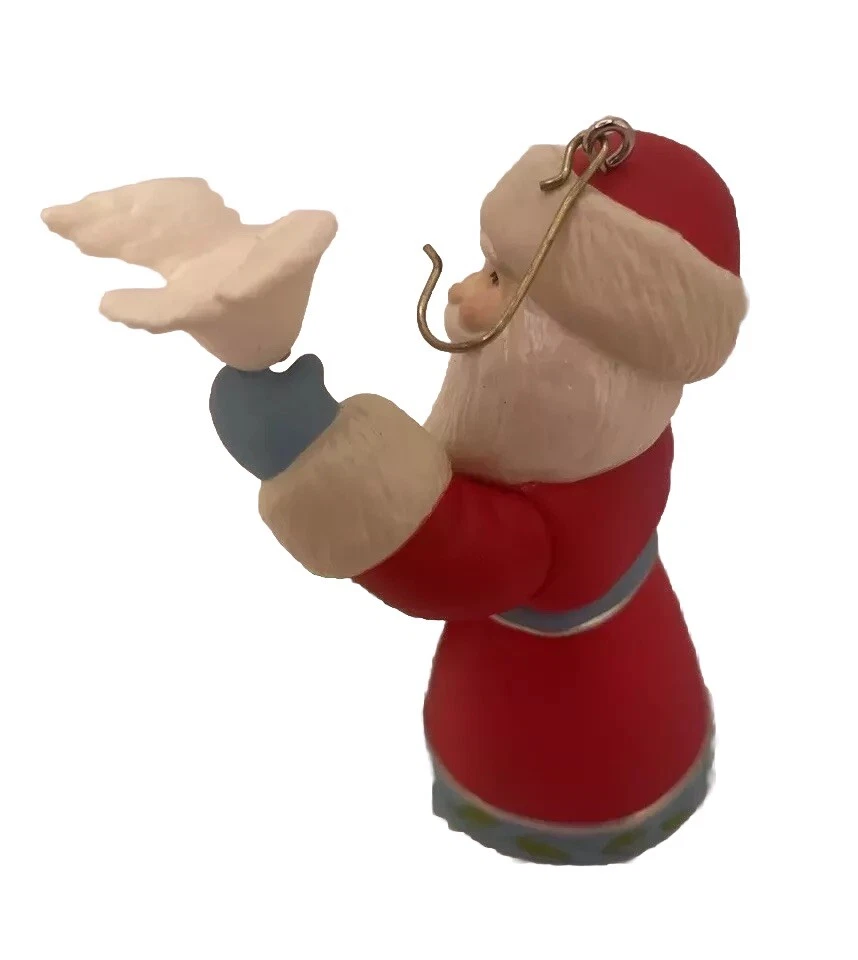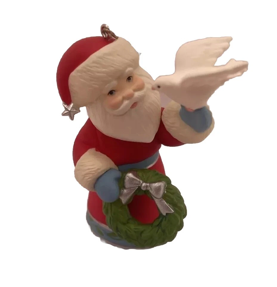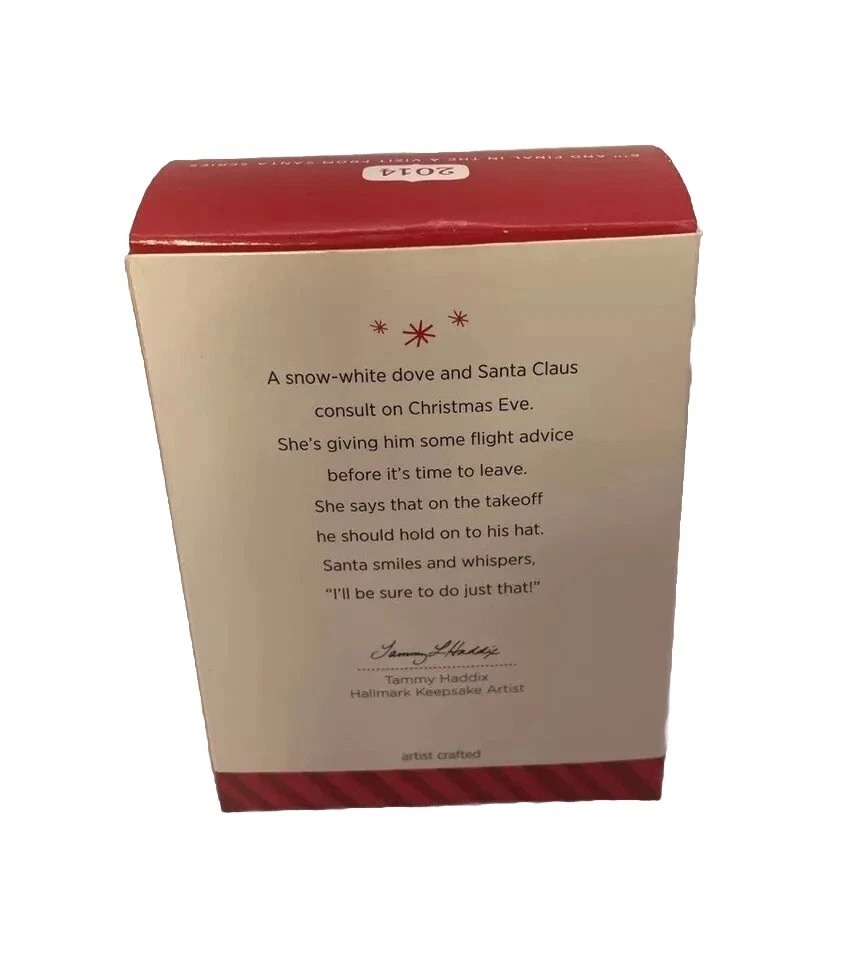 Celebrate the holiday season with this beautiful 2014 Hallmark Keepsake Ornament. The ornament features a visit from Santa, portrayed in stunning multicolor detail. Perfect for adding to your ornament collection or gifting to a loved one, this hanging ornament is part of the 6th in Series Wreath Dove collection. Crafted with care and attention to detail, this ornament is sure to bring joy and wonder to your Christmas tree. Whether you're a collector or just looking for a special ornament to cherish, this piece is a must-have. Don't miss out on the chance to add this stunning ornament to your holiday decor.