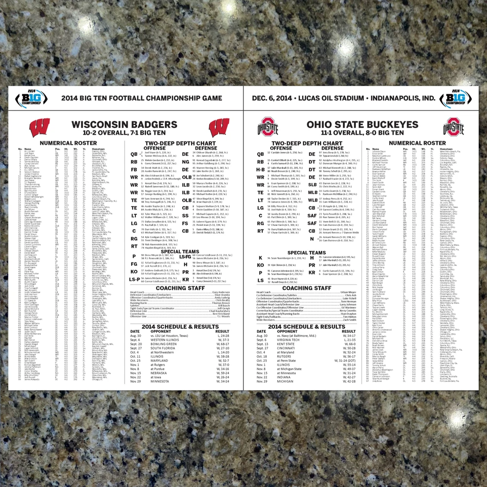 For sale, the game issued Flipcard, Media Program Notes from the 2014 Ohio State vs. Wisconsin Big 10 Championship game on December 6, 2014. In the Big Ten Championship Game, Ohio State dominated with a 59-0 victory, impressing the CFP committee and securing a playoff berth. History! Game: 2014 Big 10 Championship Teams: Ohio State vs Wisconsin Date: December 6, 2014 Stadium: LUCAS OIL STADIUM Location: INDIANAPOLIS, IND. What you get: 1. 11x17 Game Issued Media Issued Flipcard - Ohio State vs Wisconsin 2. Ohio State Media Program Game Note (1-page) 3. Wisconsin Media Program Game Note (1-page) 4. Plastic protector sheet