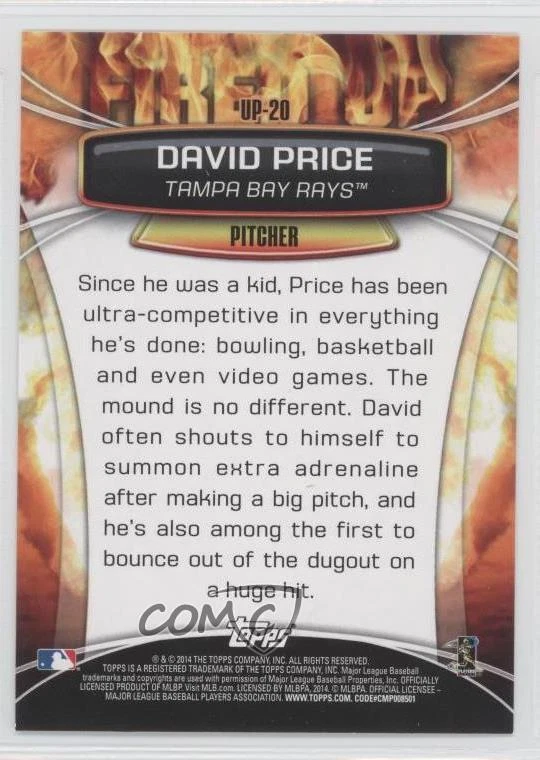 2014 Topps Opening Day - Fired Up #UP-20 David Price - Baseball Card - Featuring the Tampa Bay Rays - Featuring David Price Search for more: 2014 Topps Opening Day Search for more: 2014 Topps Opening Day - Fired Up View all of our Listings Auctions Buy It Now About Us Located in the beautiful Pacific Northwest, COMC (Check Out My Cards) is the world's largest consignment service for trading card singles. More than 10,000 people have used our consignment service to list over 50 million trading cards. We currently house 20 million cards, each listed for sale with front and back images of the actual card. Find out how we can help you consign your items on eBay by contacting us through eBay messaging. COMC -- "The Safe & Easy Way to Buy & Sell" Representative Image - Select Specific Item above to see image of actual item Representative Image - Select Specific Item above to see image of actual item Raw Condition for Modern Cards Unless otherwise noted, raw modern cards are listed in Near Mint-Mint condition or better. A NM-MT card appears to be Mint at first glance, but upon closer inspection, may exhibit some of the following: minor print defects (e.g. roller marks, print line, dimple), minor scratches, slight edge wear, and slight corner wear. Centering is clearly visible in the images provided and does not factor into our condition assessment. Raw Condition for Vintage Cards Unless otherwise noted, raw vintage cards are listed in Excellent condition or better. An EX card may exhibit some of the following: minor rounding of corners, surface wear, print defects, light scratches, and slight edge wear/chipping. Centering is clearly visible in the images provided and does not factor into our condition assessment. Domestic Shipping Combined shipping for multiple items is available. To receive combined shipping, please ensure all desired items are in your eBay shopping cart before proceeding to checkout. eBay limits orders to 40 items per order. We automatically combine multiple orders placed on the same day. If you place multiple orders on the same day, please contact us to request a refund of applicable shipping costs. Signature confirmation may be required on invoices over $400. Raw cards are shipped in toploaders. International Shipping COMC offers eBay's International Shipping (EIS) for international orders under $2,500* (see country exceptions below). All duties and import fees are paid at checkout; in the rare event that there are additional import fees upon delivery, these are borne by the buyer. EIS packages route through a shipping hub in Erlanger, KY before shipping to their final destination. Please note that EIS does not allow for combined shipments. The shipping rates are determined by eBay and cannot be adjusted. *Maximum sale price exceptions: Colombia, Kuwait ($2,000); Taiwan ($1,539); Chile, Costa Rica, Guatemala, Honduras, Trinidad and Tobago ($1,000); Antigua and Barbuda, Aruba, Belize, Dominica, Grenada, Philippines, Saint Kitts and Nevis, Saint Lucia, Montserrat, Turks and Caicos Islands ($500); Dominican Republic, El Salvador ($200). Please request a shipping quote through eBay messaging for orders that exceed the maximum sale price supported by eBay's International Shipping. You will be responsible for all duties and import fees for international orders shipped outside the EIS. Raw cards are shipped in toploaders. Payment COMC does not accept offers on our cards through our eBay storefront. COMC utilizes eBay’s managed payments system. If you are experiencing difficulties making a payment, please contact eBay for assistance. Return Policy Returns are only accepted on the rare occasion the item is not as described. If you are making a return, please initiate the return process through eBay so a mailing label can be provided for you. Prior to listing, our expert team carefully assessed this item to represent it accurately. Please review the description and high-definition images prior to purchasing to ensure this item meets your satisfaction. We welcome you to contact us if you have further questions about this item. Trust and Integrity COMC carefully assesses each item consigned to us to prevent fraudulent items from entering the marketplace. If you believe an item offered on COMC may be fraudulent, please contact us with details so we can investigate the issue. Items we determine are outside our supported items policy may be removed. Last Modified: 12/10/2024 11:39:20 PM PDT
