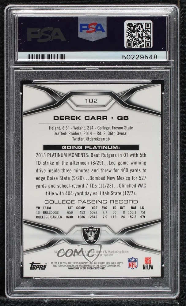 2014 Topps Platinum - [Base] - Rookies X-Fractor #102 Derek Carr Graded PSA 9 MINT - RC (Rookie Card) - Football Card - Featuring the Oakland Raiders - Featuring Derek Carr Search for more: 2014 Topps Platinum Search for more: 2014 Topps Platinum - [Base] - Rookies X-Fractor View all of our Listings Auctions Buy It Now About Us Located in the beautiful Pacific Northwest, COMC (Check Out My Cards) is the world's largest consignment service for trading card singles. More than 10,000 people have used our consignment service to list over 50 million trading cards. We currently house 20 million cards, each listed for sale with front and back images of the actual card. Find out how we can help you consign your items on eBay by contacting us through eBay messaging. COMC -- "The Safe & Easy Way to Buy & Sell" Representative Image - Select Specific Item above to see image of actual item Representative Image - Select Specific Item above to see image of actual item Raw Condition for Modern Cards Unless otherwise noted, raw modern cards are listed in Near Mint-Mint condition or better. A NM-MT card appears to be Mint at first glance, but upon closer inspection, may exhibit some of the following: minor print defects (e.g. roller marks, print line, dimple), minor scratches, slight edge wear, and slight corner wear. Centering is clearly visible in the images provided and does not factor into our condition assessment. Raw Condition for Vintage Cards Unless otherwise noted, raw vintage cards are listed in Excellent condition or better. An EX card may exhibit some of the following: minor rounding of corners, surface wear, print defects, light scratches, and slight edge wear/chipping. Centering is clearly visible in the images provided and does not factor into our condition assessment. Domestic Shipping Combined shipping for multiple items is available. To receive combined shipping, please ensure all desired items are in your eBay shopping cart before proceeding to checkout. eBay limits orders to 40 items per order. We automatically combine multiple orders placed on the same day. If you place multiple orders on the same day, please contact us to request a refund of applicable shipping costs. Signature confirmation may be required on invoices over $400. Raw cards are shipped in toploaders. International Shipping COMC offers eBay's International Shipping (EIS) for international orders under $2,500* (see country exceptions below). All duties and import fees are paid at checkout; in the rare event that there are additional import fees upon delivery, these are borne by the buyer. EIS packages route through a shipping hub in Erlanger, KY before shipping to their final destination. Please note that EIS does not allow for combined shipments. The shipping rates are determined by eBay and cannot be adjusted. *Maximum sale price exceptions: Colombia, Kuwait ($2,000); Taiwan ($1,539); Chile, Costa Rica, Guatemala, Honduras, Trinidad and Tobago ($1,000); Antigua and Barbuda, Aruba, Belize, Dominica, Grenada, Philippines, Saint Kitts and Nevis, Saint Lucia, Montserrat, Turks and Caicos Islands ($500); Dominican Republic, El Salvador ($200). Please request a shipping quote through eBay messaging for orders that exceed the maximum sale price supported by eBay's International Shipping. You will be responsible for all duties and import fees for international orders shipped outside the EIS. Raw cards are shipped in toploaders. Payment COMC does not accept offers on our cards through our eBay storefront. COMC utilizes eBay’s managed payments system. If you are experiencing difficulties making a payment, please contact eBay for assistance. Return Policy Returns are only accepted on the rare occasion the item is not as described. If you are making a return, please initiate the return process through eBay so a mailing label can be provided for you. Prior to listing, our expert team carefully assessed this item to represent it accurately. Please review the description and high-definition images prior to purchasing to ensure this item meets your satisfaction. We welcome you to contact us if you have further questions about this item. Trust and Integrity COMC carefully assesses each item consigned to us to prevent fraudulent items from entering the marketplace. If you believe an item offered on COMC may be fraudulent, please contact us with details so we can investigate the issue. Items we determine are outside our supported items policy may be removed. Last Modified: 1/18/2025 11:17:54 AM PDT