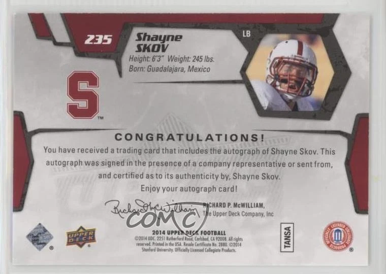 2014 Upper Deck - [Base] - Autographs #235 Star Rookies - Shayne Skov - Rookie - Football Card - Featuring the Stanford Cardinal - Featuring Shayne Skov Search for more: 2014 Upper Deck Search for more: 2014 Upper Deck - [Base] - Autographs View all of our Listings Auctions Buy It Now About Us Located in the beautiful Pacific Northwest, COMC (Check Out My Cards) is the world's largest consignment service for trading card singles. More than 10,000 people have used our consignment service to list over 50 million trading cards. We currently house 20 million cards, each listed for sale with front and back images of the actual card. Find out how we can help you consign your items on eBay by contacting us through eBay messaging. COMC -- "The Safe & Easy Way to Buy & Sell" Representative Image - Select Specific Item above to see image of actual item Representative Image - Select Specific Item above to see image of actual item Raw Condition for Modern Cards Unless otherwise noted, raw modern cards are listed in Near Mint-Mint condition or better. A NM-MT card appears to be Mint at first glance, but upon closer inspection, may exhibit some of the following: minor print defects (e.g. roller marks, print line, dimple), minor scratches, slight edge wear, and slight corner wear. Centering is clearly visible in the images provided and does not factor into our condition assessment. Raw Condition for Vintage Cards Unless otherwise noted, raw vintage cards are listed in Excellent condition or better. An EX card may exhibit some of the following: minor rounding of corners, surface wear, print defects, light scratches, and slight edge wear/chipping. Centering is clearly visible in the images provided and does not factor into our condition assessment. Domestic Shipping Combined shipping for multiple items is available. To receive combined shipping, please ensure all desired items are in your eBay shopping cart before proceeding to checkout. eBay limits orders to 40 items per order. We automatically combine multiple orders placed on the same day. If you place multiple orders on the same day, please contact us to request a refund of applicable shipping costs. Signature confirmation may be required on invoices over $400. Raw cards are shipped in toploaders. International Shipping COMC offers eBay's International Shipping (EIS) for international orders under $2,500* (see country exceptions below). All duties and import fees are paid at checkout; in the rare event that there are additional import fees upon delivery, these are borne by the buyer. EIS packages route through a shipping hub in Erlanger, KY before shipping to their final destination. Please note that EIS does not allow for combined shipments. The shipping rates are determined by eBay and cannot be adjusted. *Maximum sale price exceptions: Colombia, Kuwait ($2,000); Taiwan ($1,539); Chile, Costa Rica, Guatemala, Honduras, Trinidad and Tobago ($1,000); Antigua and Barbuda, Aruba, Belize, Dominica, Grenada, Philippines, Saint Kitts and Nevis, Saint Lucia, Montserrat, Turks and Caicos Islands ($500); Dominican Republic, El Salvador ($200). Please request a shipping quote through eBay messaging for orders that exceed the maximum sale price supported by eBay's International Shipping. You will be responsible for all duties and import fees for international orders shipped outside the EIS. Raw cards are shipped in toploaders. Payment COMC does not accept offers on our cards through our eBay storefront. COMC utilizes eBay’s managed payments system. If you are experiencing difficulties making a payment, please contact eBay for assistance. Return Policy Returns are only accepted on the rare occasion the item is not as described. If you are making a return, please initiate the return process through eBay so a mailing label can be provided for you. Prior to listing, our expert team carefully assessed this item to represent it accurately. Please review the description and high-definition images prior to purchasing to ensure this item meets your satisfaction. We welcome you to contact us if you have further questions about this item. Trust and Integrity COMC carefully assesses each item consigned to us to prevent fraudulent items from entering the marketplace. If you believe an item offered on COMC may be fraudulent, please contact us with details so we can investigate the issue. Items we determine are outside our supported items policy may be removed. Last Modified: 12/24/2024 10:55:07 PM PDT