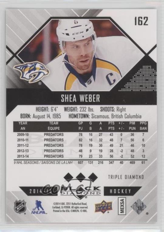 2014-15 Upper Deck Black Diamond - [Base] #162 Shea Weber - Ice Hockey Card - Featuring the Nashville Predators - Featuring Shea Weber Search for more: 2014-15 Upper Deck Black Diamond Search for more: 2014-15 Upper Deck Black Diamond - [Base] View all of our Listings Auctions Buy It Now About Us Located in the beautiful Pacific Northwest, COMC (Check Out My Cards) is the world's largest consignment service for trading card singles. More than 10,000 people have used our consignment service to list over 50 million trading cards. Find out how we can help you consign your items on eBay by contacting us through eBay messaging. COMC -- "The Safe & Easy Way to Buy & Sell" Representative Image - Select Specific Item above to see image of actual item Representative Image - Select Specific Item above to see image of actual item Raw Condition for Modern Cards Unless otherwise noted, raw modern cards are listed in Near Mint-Mint condition or better. A NM-MT card appears to be Mint at first glance, but upon closer inspection, may exhibit some of the following: minor print defects (e.g. roller marks, print line, dimple), minor scratches, slight edge wear, and slight corner wear. Centering is clearly visible in the images provided and does not factor into our condition assessment. Raw Condition for Vintage Cards Unless otherwise noted, raw vintage cards are listed in Excellent condition or better. An EX card may exhibit some of the following: minor rounding of corners, surface wear, print defects, light scratches, and slight edge wear/chipping. Centering is clearly visible in the images provided and does not factor into our condition assessment. Domestic Shipping Combined shipping for multiple items is available. To receive combined shipping, please ensure all desired items are in your eBay shopping cart before proceeding to checkout. eBay limits orders to 40 items per order. We automatically combine multiple orders placed on the same day. If you place multiple orders on the same day, please contact us to request a refund of applicable shipping costs. Signature confirmation may be required on invoices over $400. All cards are protected and shipped securely. International Shipping COMC offers eBay's International Shipping (EIS) for international orders under $2,500* (see country exceptions below). All duties and import fees are paid at checkout; in the rare event that there are additional import fees upon delivery, these are borne by the buyer. EIS packages route through a shipping hub in Erlanger, KY before shipping to their final destination. Please note that EIS does not allow for combined shipments. The shipping rates are determined by eBay and cannot be adjusted. *Maximum sale price exceptions: Colombia, Kuwait ($2,000); Taiwan ($1,539); Chile, Costa Rica, Guatemala, Honduras, Trinidad and Tobago ($1,000); Antigua and Barbuda, Aruba, Belize, Dominica, Grenada, Philippines, Saint Kitts and Nevis, Saint Lucia, Montserrat, Turks and Caicos Islands ($500); Dominican Republic, El Salvador ($200). Please request a shipping quote through eBay messaging for orders that exceed the maximum sale price supported by eBay's International Shipping. You will be responsible for all duties and import fees for international orders shipped outside the EIS. All cards are protected and shipped securely. Payment COMC does not accept offers on our cards through our eBay storefront. COMC utilizes eBay’s managed payments system. If you are experiencing difficulties making a payment, please contact eBay for assistance. Return Policy Returns are only accepted on the rare occasion the item is not as described. If you are making a return, please initiate the return process through eBay so a mailing label can be provided for you. Prior to listing, our expert team carefully assessed this item to represent it accurately. Please review the description and high-definition images prior to purchasing to ensure this item meets your satisfaction. We welcome you to contact us if you have further questions about this item. Trust and Integrity COMC carefully assesses each item consigned to us to prevent fraudulent items from entering the marketplace. If you believe an item offered on COMC may be fraudulent, please contact us with details so we can investigate the issue. Items we determine are outside our supported items policy may be removed. Last Modified: 6/7/2025 6:34:44 AM PDT
