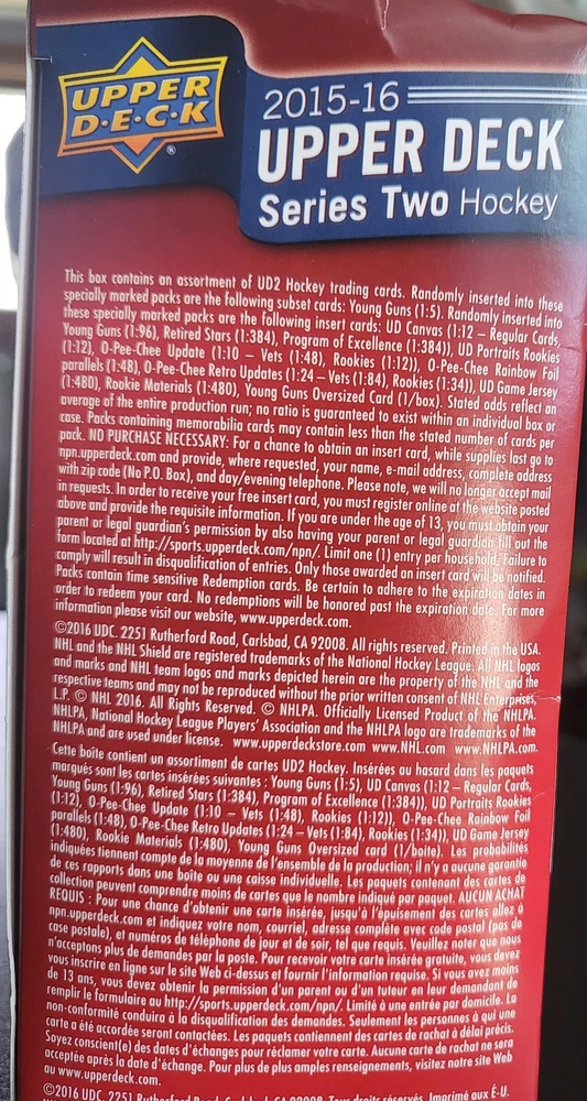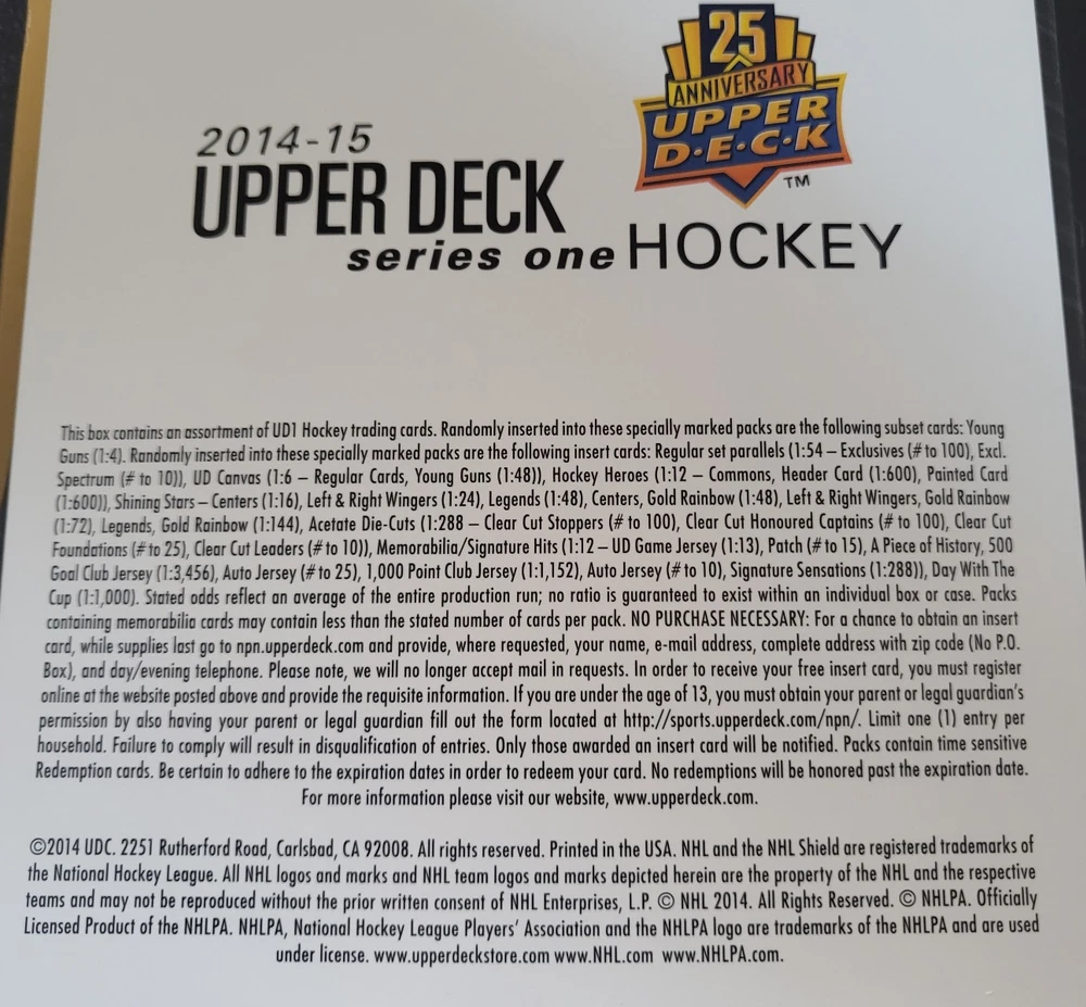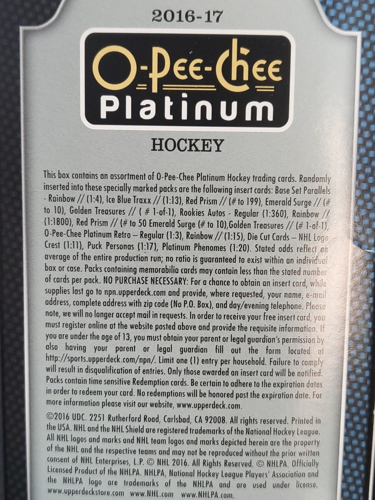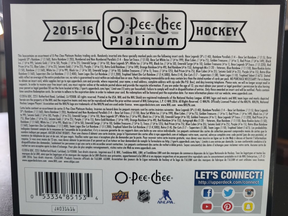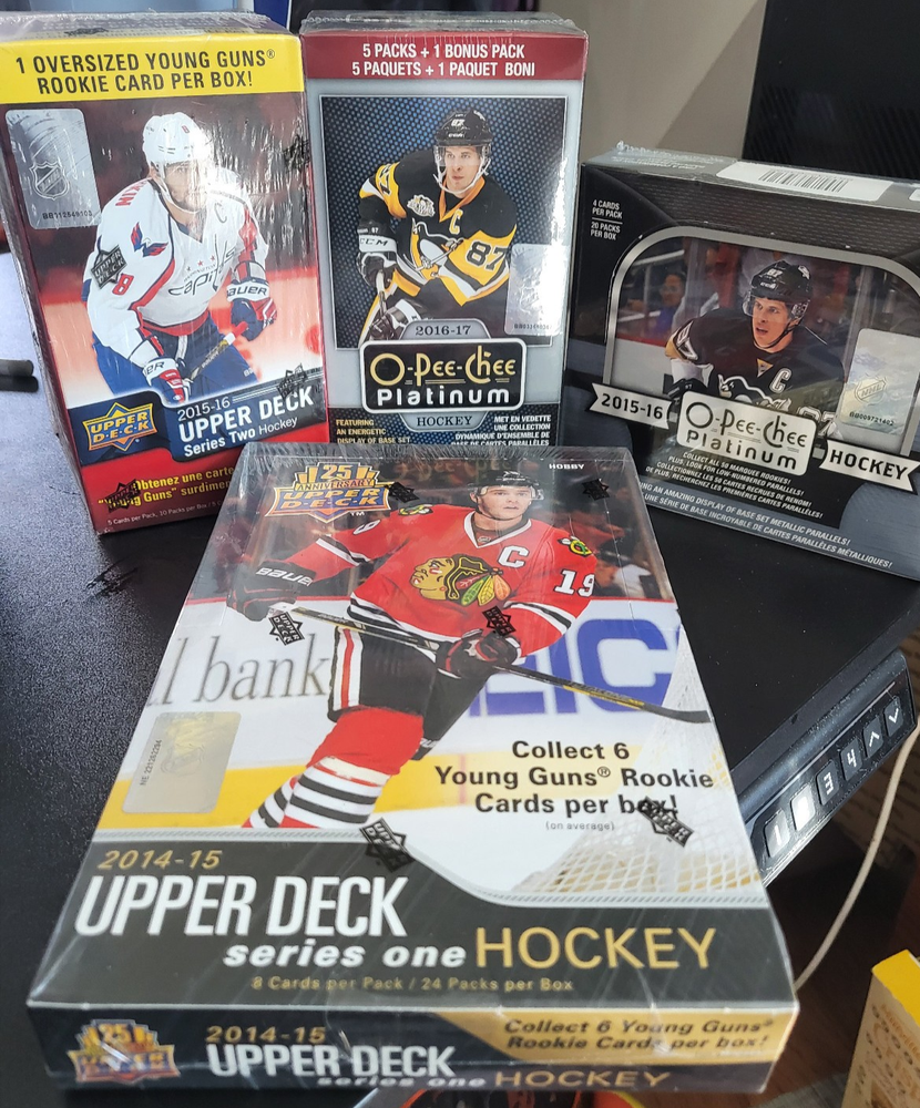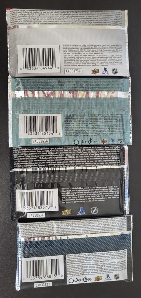 The 4 Packs included are: 2014-15 Upper Deck Series 1 Hockey 8 Card Hobby Pack - UPC: 053334 825702 2015-16 Upper Deck Series 2 Hockey 5 Card Blaster Pack - UPC: 053334 849449 2015-16 UD O-Pee-Chee Platinum 4 Card Hobby Pack - UPC: 053334 851541 2016-17 UD O-Pee-Chee Platinum 4 Card Blaster Pack - UPC: 053334 868150 mint packs