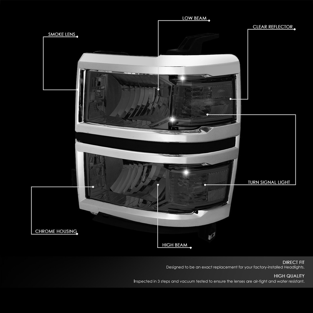 Welcome to Speed Daddy Store Home About Us Feedback Add To Favorites New Arrivals Ending Soon Contact Us FOR 2014-2015 CHEVY SILVERADO 1500 LED SMOKED CLEAR HEADLIGHTS+FOG LAMPS KIT Product Description A headlight (headlamp) is a lamp attached to the front of a vehicle to light the road ahead. Headlight performance has steadily improved throughout the automobile age, spurred by the great disparity between daytime and nighttime traffic fatalities. Headlights are one of the most important components of your vehicle; they allow you to see the road in front of you clearly during the night and in any bad weather that may arise. Our headlights upgrade the face of your vehicle with clear style and extreme range. Fog lights are usually a factory option, and provide great auxiliary lighting to complement the headlights. Fog lights are especially useful in adverse conditions such as rain, snow, and fog, when visibility is significantly reduced. Fog lights mount to factory predetermined areas on the bumper where they look the best and do not sacrifice aerodynamics. Specifics and Features : Headlight: Plug-n-Play Operation, Direct Bolt-On OE Fitment or Replacement for the Stock Unit Comes with a Complete Set of Headlight (Driver and Passenger Side) Brings a Different Appearance to Vehicle that's Great for Show use or to Replace Old and Worn Headlights Requires no Modification or Drilling LED Fog Light: Plug-n-Play Operation, Direct Bolt-On OE Fitment or Replacement for the Stock Unit High Powered LED Lighting to Replace Factory Halogen Fog Light Housings 6000K Color Temperature White LED Lighting Wiring Harness & Switch for Easy Installation Enhance Visibility During Night Time, Heavy Rain, Snow, or Dense Fog Brings a Different Appearance to Vehicle thats Great for Show Use or to Replace Old and Worn Fog Lights Includes : 1 X Pair of Headlights (Left & Right) 1 x Pair of Fog Lights (Left & Right) 1 x Pair of Fog Light Mounting Brackets (Left & Right) 1 x Wiring Harness 1 x Switch Notes : Compatible with: 14-15 Chevrolet Silverado 1500 100% Brand New Professional Installation is Highly Recommended Installation Instruction is NOT Included Shipping Payment Returns Terms & Conditions Feedback Contact Us DOMESTIC LOWER 48 US STATES: FREE SALES TAX: CA ONLY VERY IMPORTANT: Double check shipping address. We are not responsible for incorrect or undeliverable addresses. Please use Shipping & Payments tab on top of page for shipping details for your location. Shipping to PR, HI, AK and PO Box addresses will be charged the same as shipping to Canada. GU, VI, SAIPAN will be charged the same as international shipping rate. For Canada shipping please select the lowest price. We do not offer expedited shipping. US Territories such as GU, VI, SAIPAN will be charged the same as CANADA shipping rate. Transaction will be held until a full shipping amount received. Some of the packages cannot be delivered to a PO Box. Customer is responsible to ensure PO Box address given is deliverable by the shipping company. Package will be held until a valid physical address is provided. Customer assumes shipping charges incurred in shipping to undeliverable address. International buyers are responsible for all customs duties, taxes, and other applicable fees incurred by the country's customs/border regulations. Please contact customs for more information. We ship 98% of all orders the same or next business day after payment received/cleared. Please understand that once orders are shipped, we cannot control the transit times thereafter. Most orders will ship via USPS First Class/Priority Mail or FedEx/UPS or the best suitable carrier for the specific size of the product. We are not responsible for any changes to address after item has been shipped. Item will be shipped out within 24 hours after payment cleared, except for weekends and holidays. PayPal e-check takes 3-7 business days to be processed. We will not ship until an e-check has been cleared. 30 Days Free Returns, please notify us within 30 days after you've received your order. Please email us or call us to obtain a RMA (Return Merchandise Authorization) number from us, and have the RMA number written on the return package. Items to be returned must be in resalable condition. All returns are for refund ONLY. No exchange accepted. For emissions related items, please check with your local jurisdiction for emission specific requirements before purchasing. All items do not come with installation instruction unless otherwise specified. If item is questionable, please consult your local professional/mechanic before making purchase. Shipping DOMESTIC LOWER 48 US STATES: FREE SALES TAX: CA ONLY VERY IMPORTANT: Double check shipping address. We are not responsible for incorrect or undeliverable addresses. Please use Shipping & Payments tab on top of page for shipping details for your location. Shipping to PR, HI, AK and PO Box addresses will be charged the same as shipping to Canada. GU, VI, SAIPAN will be charged the same as international shipping rate. For Canada shipping please select the lowest price. We do not offer expedited shipping. US Territories such as GU, VI, SAIPAN will be charged the same as CANADA shipping rate. Transaction will be held until a full shipping amount received. Some of the packages cannot be delivered to a PO Box. Customer is responsible to ensure PO Box address given is deliverable by the shipping company. Package will be held until a valid physical address is provided. Customer assumes shipping charges incurred in shipping to undeliverable address. International buyers are responsible for all customs duties, taxes, and other applicable fees incurred by the country's customs/border regulations. Please contact customs for more information. We ship 98% of all orders the same or next business day after payment received/cleared. Please understand that once orders are shipped, we cannot control the transit times thereafter. Most orders will ship via USPS Fi