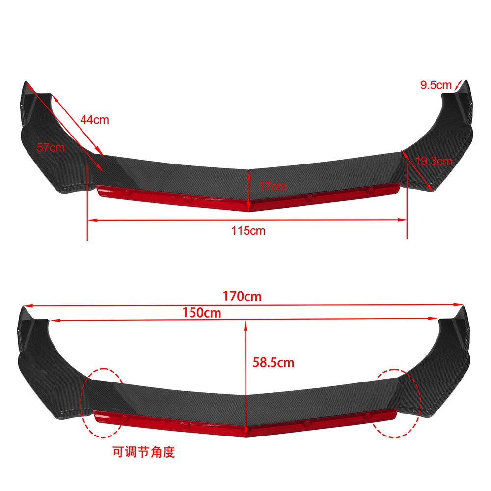 Package Included: 4 pcs /set Front Bumper Lip Chin Body Kits Pair of 2.2m/86.6" Side Skirts Extension (L&R) 2 x Strut Rods 1 x Screws kit Feature: Give your vehicles sporty appearance. More longer and wider than others. Provide an elegant and personalized appearance. Prevent the car from being scraped and improve the level of the decoration of the car. Come with screws, More convenient installation and stable installation. Instruction Not Included, Professional Installation Is Highly Recommended. Specification: Front Bumper Lip Type:Front Bumper Lip Body Kit Spoiler Material:ABS Color:Carbon Fiber -Placement on Vehicle:Front;Lower -Fitment Type:Performance/Custom Side Skirt Extension -Type:Side Skirt Extensions -Material: Polypropylene - PP - Color:Carbon Fiber -Length Size:2.2m(Make Sure 2.2m Length is the size you want!!!!!!!!!!!!!!!!!!!!!) -Weight:2500g Strut Rods Color:Red Material: premium quality aluminum alloy Length: adjustable from 8" to 13" (200mm-330mm) Position: This exquisite and compact lever is mainly fixed on the body components (front and rear surround, skirt, head and tail lip), and can also be installed in the car center console or interior trim panel Note: Require drilling holes into the bumper lip diffuser to attach safely to the vehicle.