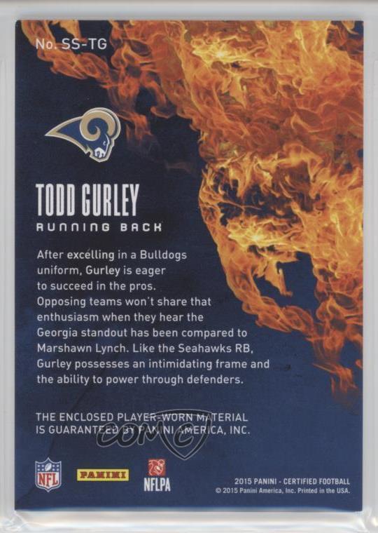2015 Panini Certified - Scorching Swatches - Mirror Red #SS-TG Todd Gurley Qty Made: 249 - Rookie - Football Card - Featuring the St. Louis Rams - Featuring Todd Gurley II Search for more: 2015 Panini Certified Search for more: 2015 Panini Certified - Scorching Swatches - Mirror Red View all of our Listings Auctions Buy It Now About Us Located in the beautiful Pacific Northwest, COMC (Check Out My Cards) is the world's largest consignment service for trading card singles. More than 10,000 people have used our consignment service to list over 50 million trading cards. We currently house 20 million cards, each listed for sale with front and back images of the actual card. Find out how we can help you consign your items on eBay by contacting us through eBay messaging. COMC -- "The Safe & Easy Way to Buy & Sell" Representative Image - Select Specific Item above to see image of actual item Representative Image - Select Specific Item above to see image of actual item Raw Condition for Modern Cards Unless otherwise noted, raw modern cards are listed in Near Mint-Mint condition or better. A NM-MT card appears to be Mint at first glance, but upon closer inspection, may exhibit some of the following: minor print defects (e.g. roller marks, print line, dimple), minor scratches, slight edge wear, and slight corner wear. Centering is clearly visible in the images provided and does not factor into our condition assessment. Raw Condition for Vintage Cards Unless otherwise noted, raw vintage cards are listed in Excellent condition or better. An EX card may exhibit some of the following: minor rounding of corners, surface wear, print defects, light scratches, and slight edge wear/chipping. Centering is clearly visible in the images provided and does not factor into our condition assessment. Domestic Shipping Combined shipping for multiple items is available. To receive combined shipping, please ensure all desired items are in your eBay shopping cart before proceeding to checkout. eBay limits orders to 40 items per order. We automatically combine multiple orders placed on the same day. If you place multiple orders on the same day, please contact us to request a refund of applicable shipping costs. Signature confirmation may be required on invoices over $400. Raw cards are shipped in toploaders. International Shipping COMC offers eBay's International Shipping (EIS) for international orders under $2,500* (see country exceptions below). All duties and import fees are paid at checkout; in the rare event that there are additional import fees upon delivery, these are borne by the buyer. EIS packages route through a shipping hub in Erlanger, KY before shipping to their final destination. Please note that EIS does not allow for combined shipments. The shipping rates are determined by eBay and cannot be adjusted. *Maximum sale price exceptions: Colombia, Kuwait ($2,000); Taiwan ($1,539); Chile, Costa Rica, Guatemala, Honduras, Trinidad and Tobago ($1,000); Antigua and Barbuda, Aruba, Belize, Dominica, Grenada, Philippines, Saint Kitts and Nevis, Saint Lucia, Montserrat, Turks and Caicos Islands ($500); Dominican Republic, El Salvador ($200). Please request a shipping quote through eBay messaging for orders that exceed the maximum sale price supported by eBay's International Shipping. You will be responsible for all duties and import fees for international orders shipped outside the EIS. Raw cards are shipped in toploaders. Payment COMC does not accept offers on our cards through our eBay storefront. COMC utilizes eBay’s managed payments system. If you are experiencing difficulties making a payment, please contact eBay for assistance. Return Policy Returns are only accepted on the rare occasion the item is not as described. If you are making a return, please initiate the return process through eBay so a mailing label can be provided for you. Prior to listing, our expert team carefully assessed this item to represent it accurately. Please review the description and high-definition images prior to purchasing to ensure this item meets your satisfaction. We welcome you to contact us if you have further questions about this item. Trust and Integrity COMC carefully assesses each item consigned to us to prevent fraudulent items from entering the marketplace. If you believe an item offered on COMC may be fraudulent, please contact us with details so we can investigate the issue. Items we determine are outside our supported items policy may be removed. Last Modified: 11/30/2024 10:08:13 PM PDT
