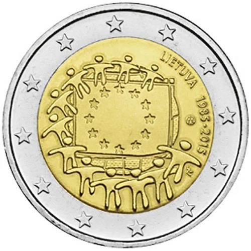 Mint: Lithuanian Mint Denomination: €2 Quality: UNC Issue limit: 750,000 Alloy: Base Metal Diameter: 25.75 mm Weight: 8.5 grams Design: Georgios Stamatopoulos Box/Capsule: No/No Certificate: No In 2015, the nineteen euro-area countries will jointly issue a commemorative euro coin to celebrate 30 years of the EU flag. This is the fourth time the euro-area members have decided to collectively issue a commemorative coin: The first three common commemorative coins were issued in 2007 (50 years of the Treaty of Rome), 2009 (10 years of Economic and Monetary Union) and 2012 (10 years of euro cash). The design of the special two-euro piece paying tribute to the 30th anniversary of the EU flag was chosen through a design contest organized by the European Commission. A total of 62 submissions were made by Eurozone mints, and a preliminary jury selected five submissions for voting by EU citizens. The winning design, with 30% of the online vote, was by the hand of Georgios Stamatopoulos from the Bank Of Greece. The commemorative coin's obverse is identical to that of ordinary €2 circulation coins.
