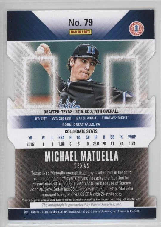 Card Name: Michael Matuella Type: Sports Trading Card Parallel/Variety: Status Purple Die-Cut Prospects Autographs Original/Reprint: Original Card Number: 79 Manufacturer: Panini America, Inc. Franchise: N/A Year: 2015 Professional Grader: None Card Manufacturer: Panini America, Inc. Year Manufactured: 2015 Team: Texas Rangers Season: 2015 Grade: Ungraded Graded: No Player/Athlete: Michael Matuella Athlete: Michael Matuella Sport: Baseball Product: Single-Parallel Set: 2015 Panini Elite Extra Edition - [Base] - Status Purple Die-Cut Player: Michael Matuella Card Attributes: Autograph, Rookie, SerialNumbered