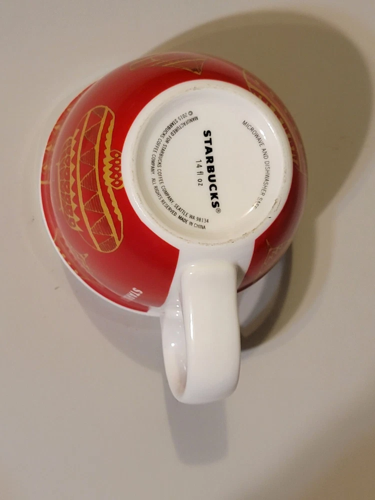 This beautiful Starbucks mug is the perfect addition to any collection. Featuring a classic white color with gold ornaments, it's a stunning piece that will catch the eye of anyone who sees it. Made in China in 2015, this original mug is perfect for coffee or tea lovers and is sure to become a favorite. With a 14oz capacity, this mug is perfect for holding your favorite hot beverage. Whether you're a collector or just looking for a unique mug to add to your collection, this Starbucks mug is sure to impress. So why wait? Add it to your collection today!