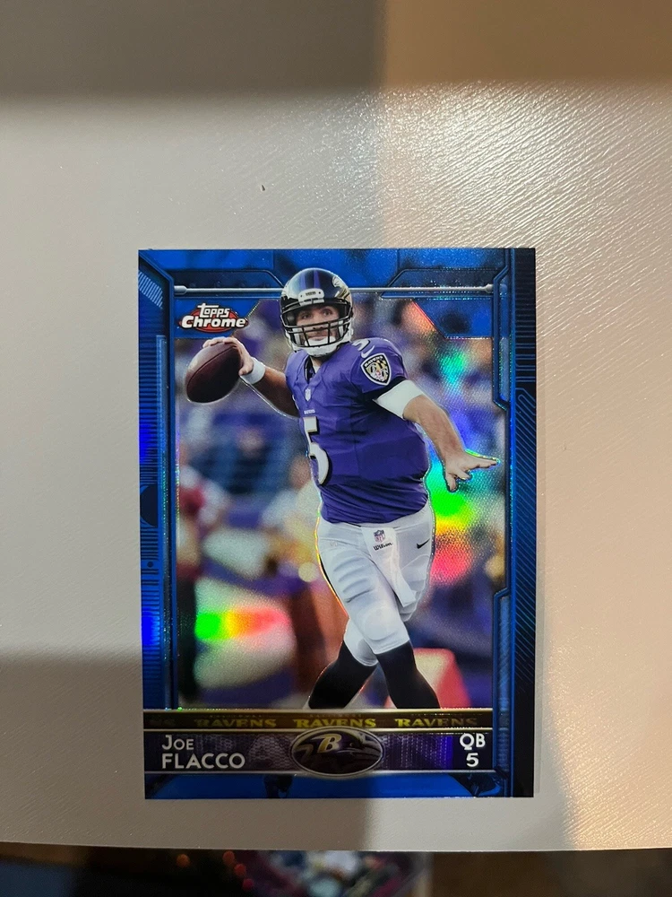 Really nice looking blue refractor of Joe Flacco of the Baltimore Ravens. Would be a great addition to any collection!