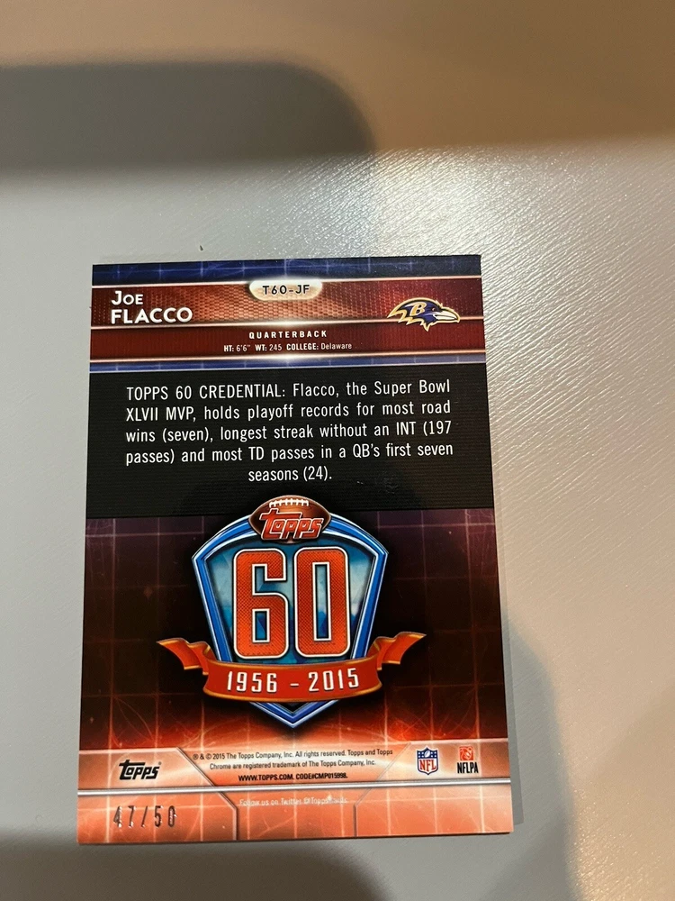 Really great looking refractor of Joe Flacco of the Baltimore Ravens. Rare card that looks even better in person. Would be a great addition to any collection!