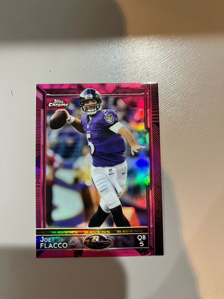 Really great looking rare pink refractor of Joe Flacco of the Baltimore Ravens. Nice card would be a great addition to any collection!